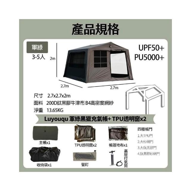充氣帳 充氣帳篷 帳篷 超輕量充氣帳 鈦黑膠充氣帳 5000+防水係數 大面積落地窗設計 拉鍊擴充系統 充氣帳 底布