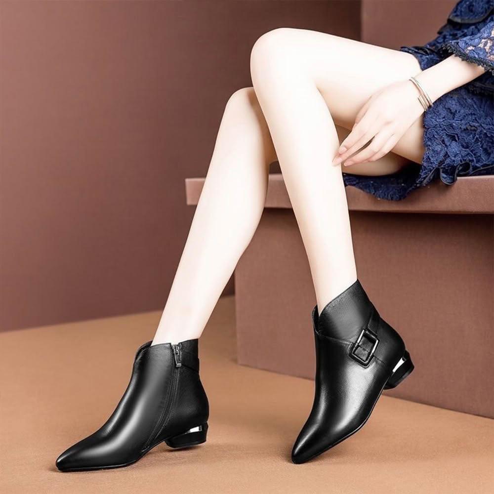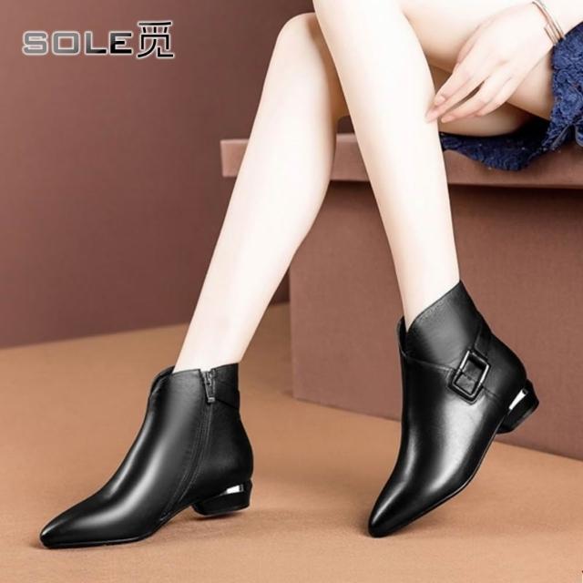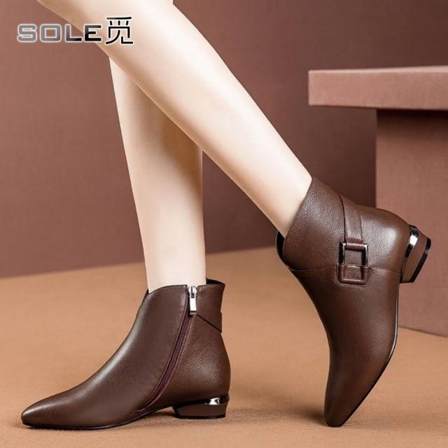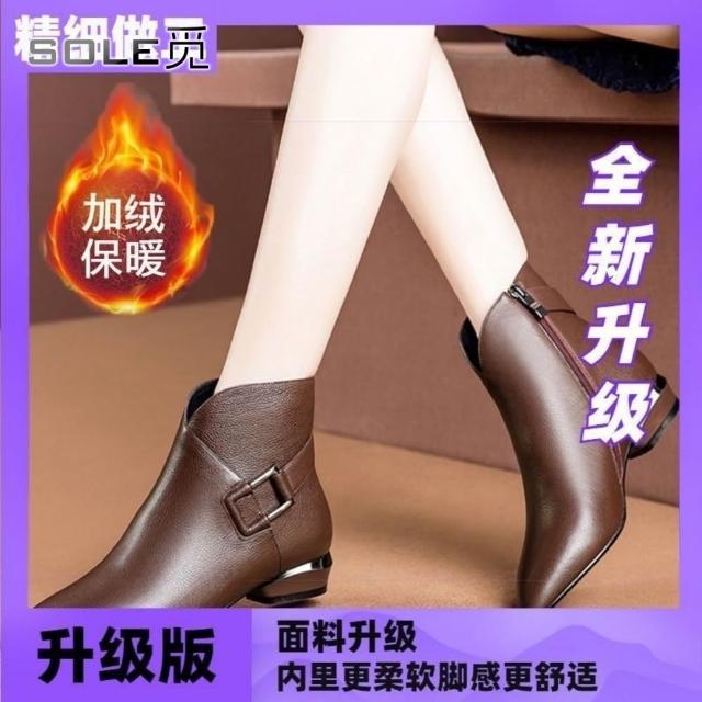 SOLE覓 真皮靴子秋冬季新款粗跟短筒矮靴平底保暖皮鞋拉鏈加絨女靴 踝靴 短靴女 素麵短靴 皮麵短靴 增高短靴