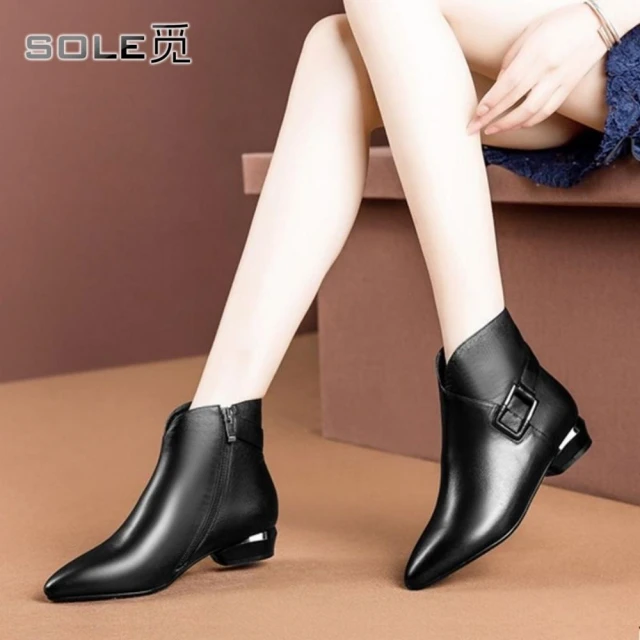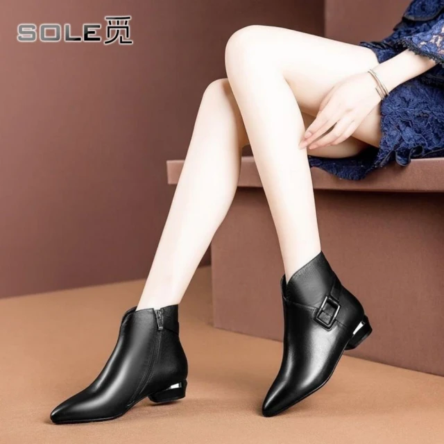 SOLE覓 真皮靴子秋冬季新款粗跟短筒矮靴平底保暖皮鞋拉鏈加絨女靴 踝靴 短靴女 素麵短靴 皮麵短靴 增高短靴