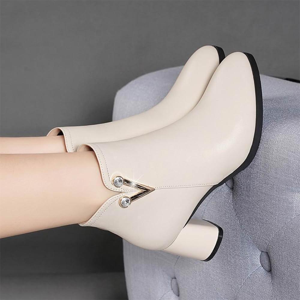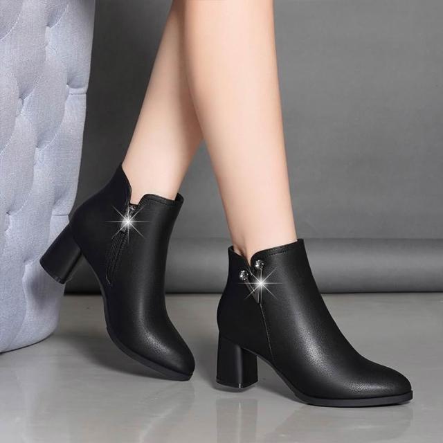 SOLE覓 粗跟尖頭短靴女秋季百麗氣質百搭時尚軟底中跟水鑽馬丁靴 踝靴 短靴女 素麵短靴 皮麵短靴 增高短靴