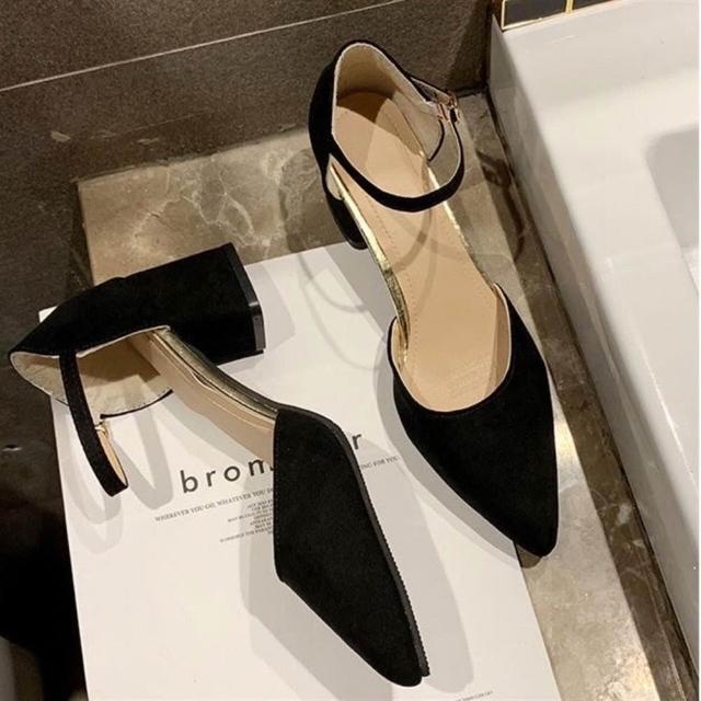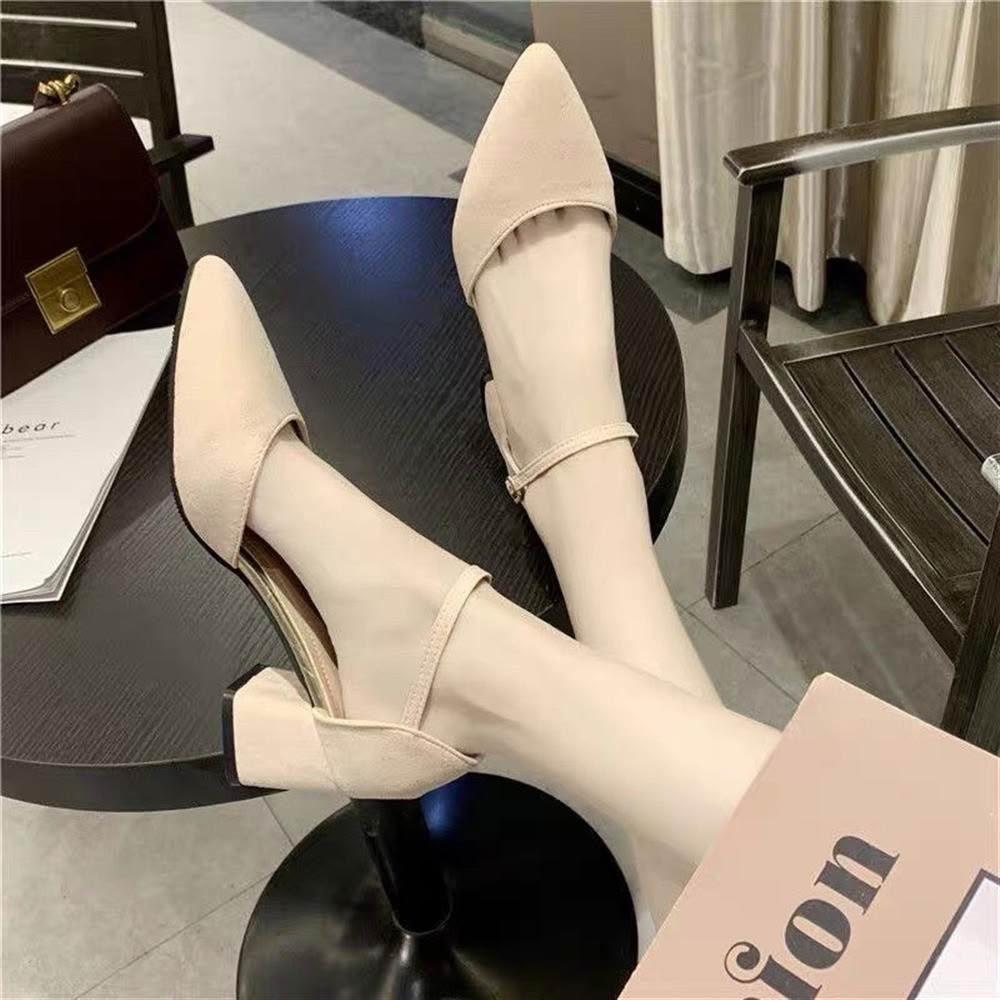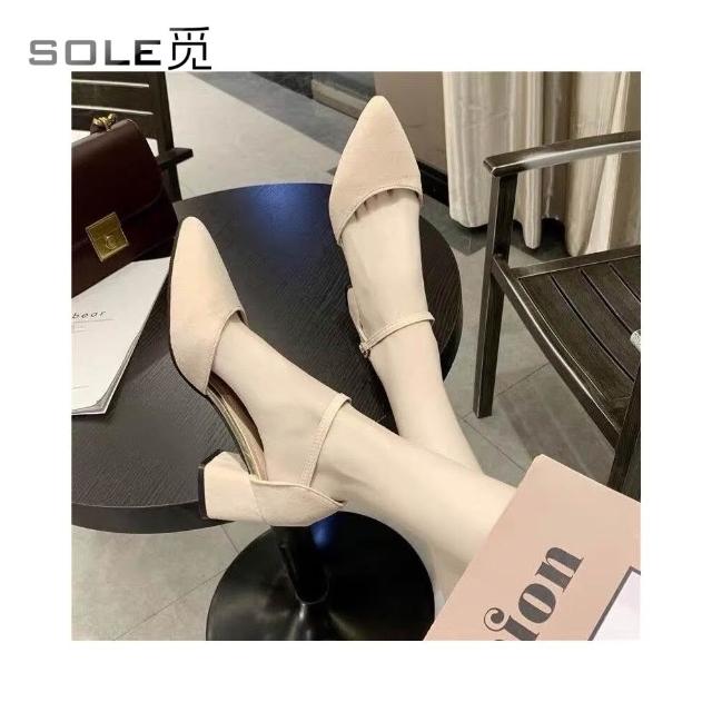 SOLE觅 粗跟涼鞋 大尺碼 粉色 粗跟絨布扣帶尖頭中跟鞋 高跟鞋 黑色 粗跟OL舒適休閒單鞋女鞋 女鞋 高跟。