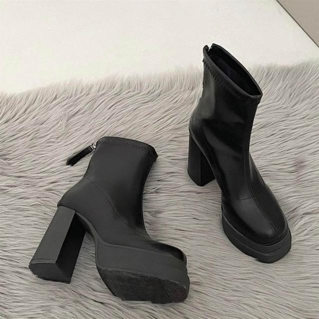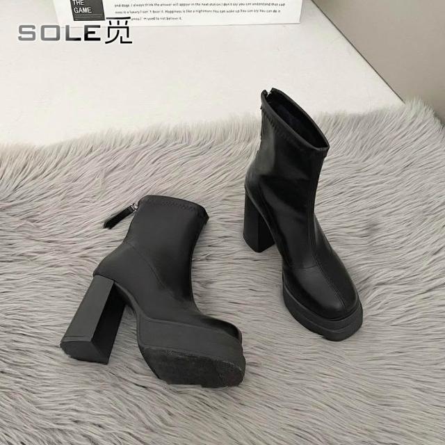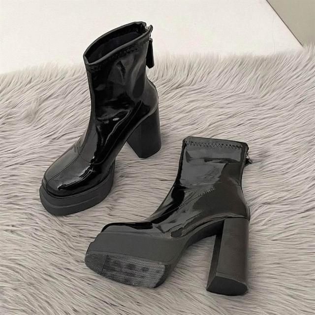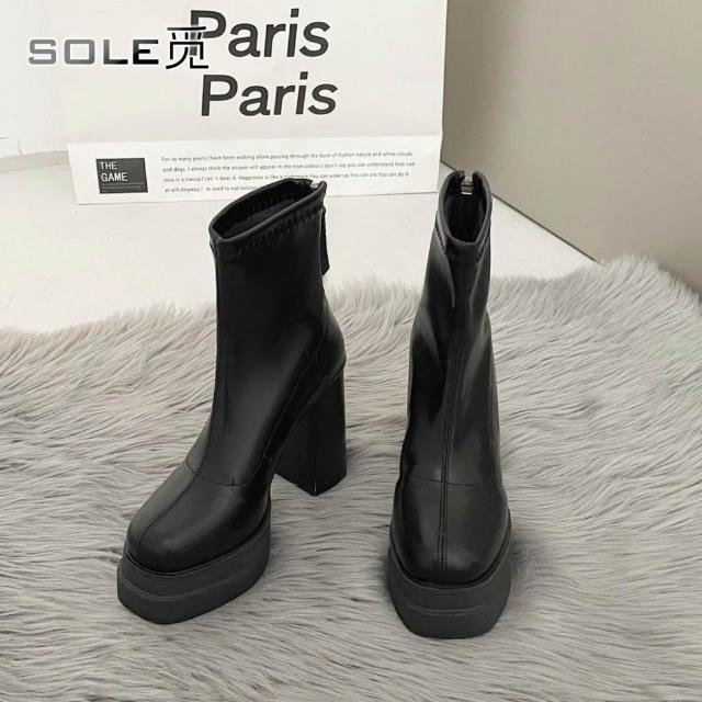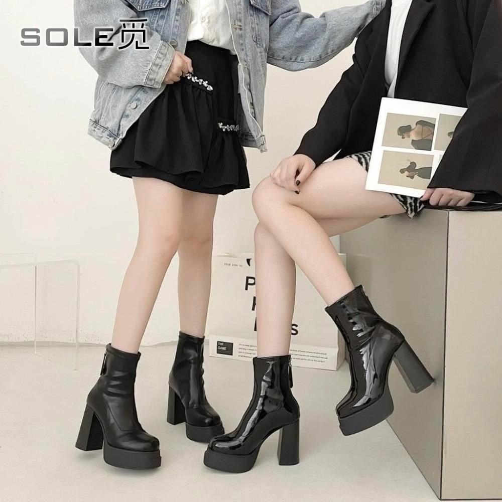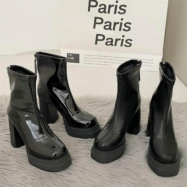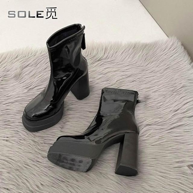 SOLE 覓 8cm高跟鞋靴子 粗跟厚底短靴 新款小個子 增高靴子 彈力瘦瘦靴 漆皮超高跟鞋 靴子女