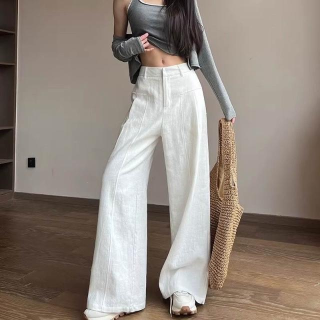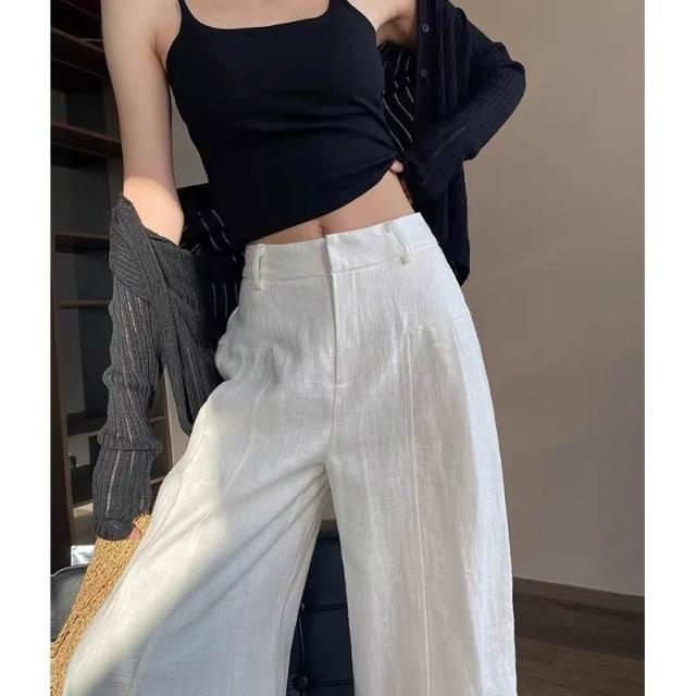 優先購白色亞麻苧麻闊腿褲女夏季薄款高腰垂感老錢風西裝直筒棉麻休閒褲