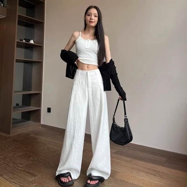 優先購白色亞麻苧麻闊腿褲女夏季薄款高腰垂感老錢風西裝直筒棉麻休閒褲