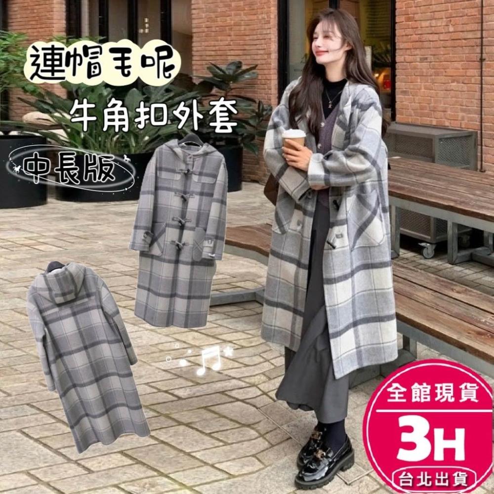 AS 梨卡隔日到貨 女裝 大衣 毛呢 外套 復古格紋 保暖大衣 連帽毛呢 中長款外套 牛角扣大衣 VG057【現貨24H】