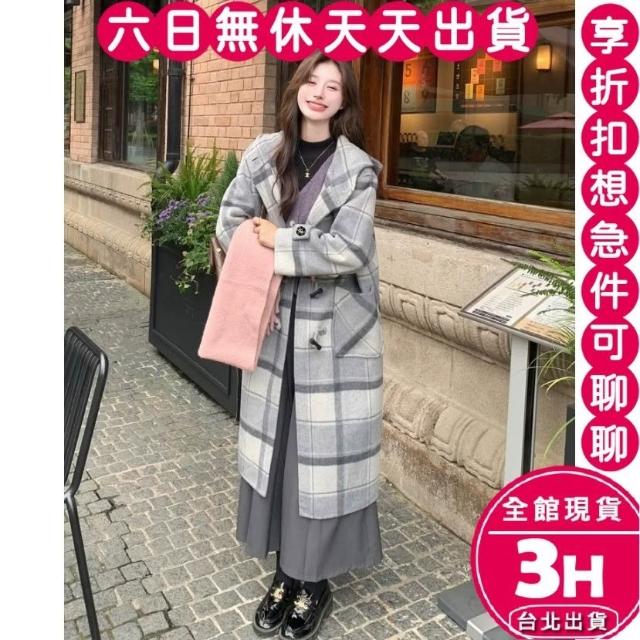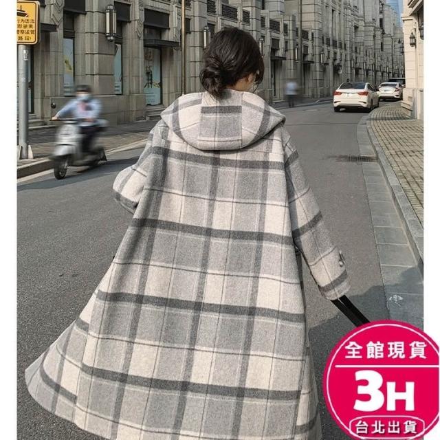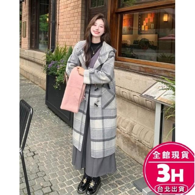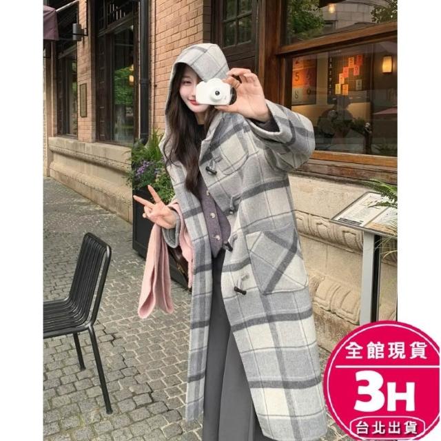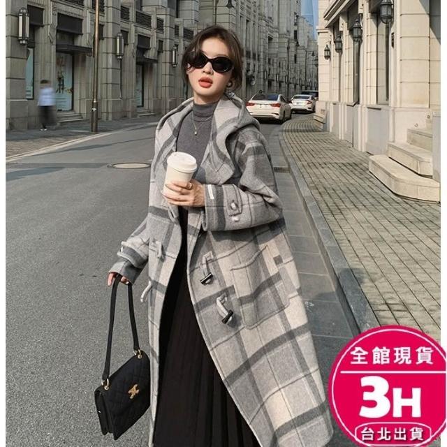 AS 梨卡隔日到貨 女裝 大衣 毛呢 外套 復古格紋 保暖大衣 連帽毛呢 中長款外套 牛角扣大衣 VG057【現貨24H】