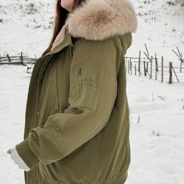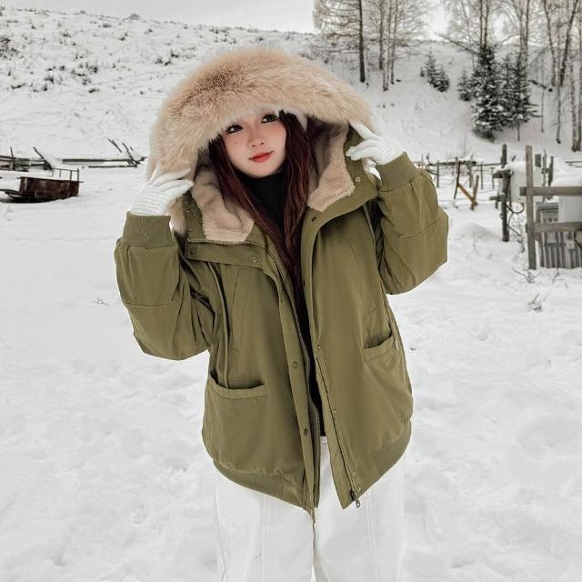 Miss38Miss38 大毛領(可拆)派克棉服 連帽外套【DD8743】(現貨)棕橺綠 大尺碼保暖防風鋪棉夾克 內裡夾棉領帽加絨