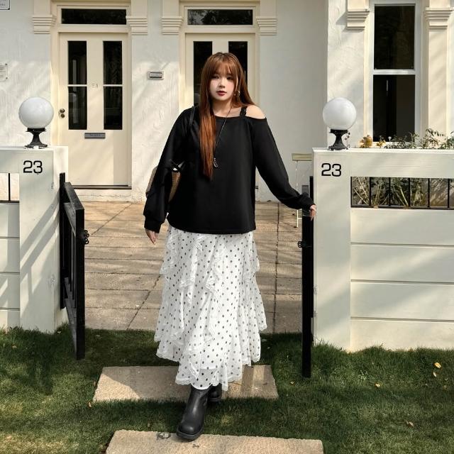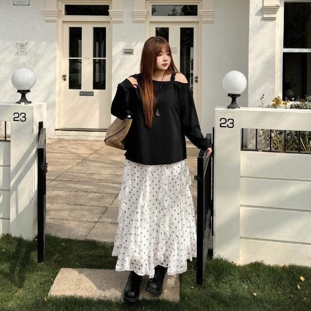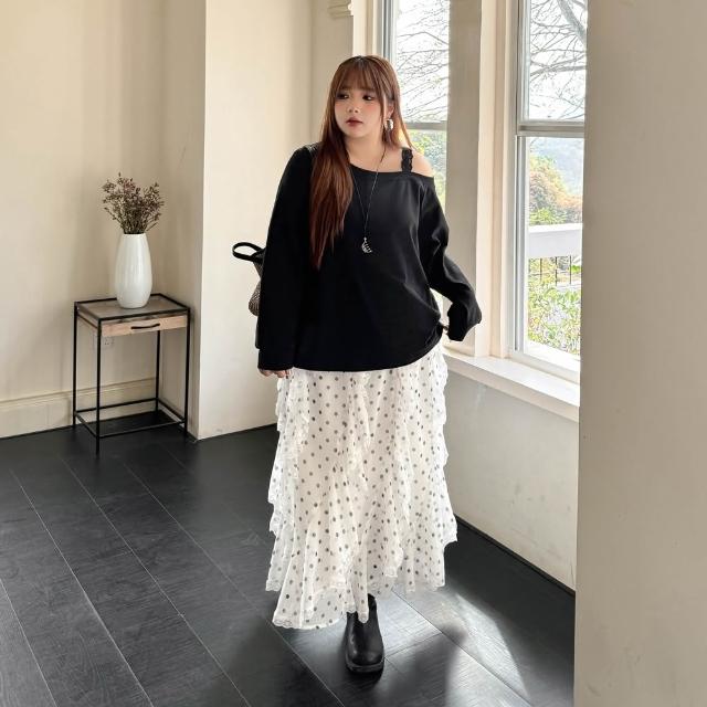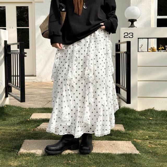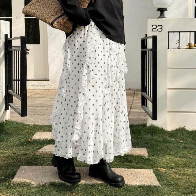 Miss38Miss38 法式CHIC 點點雪紡白長裙【EC9128-1】(現貨)大尺碼A字裙 鬆緊腰有內裡 夏天梨形穿搭 過膝長裙