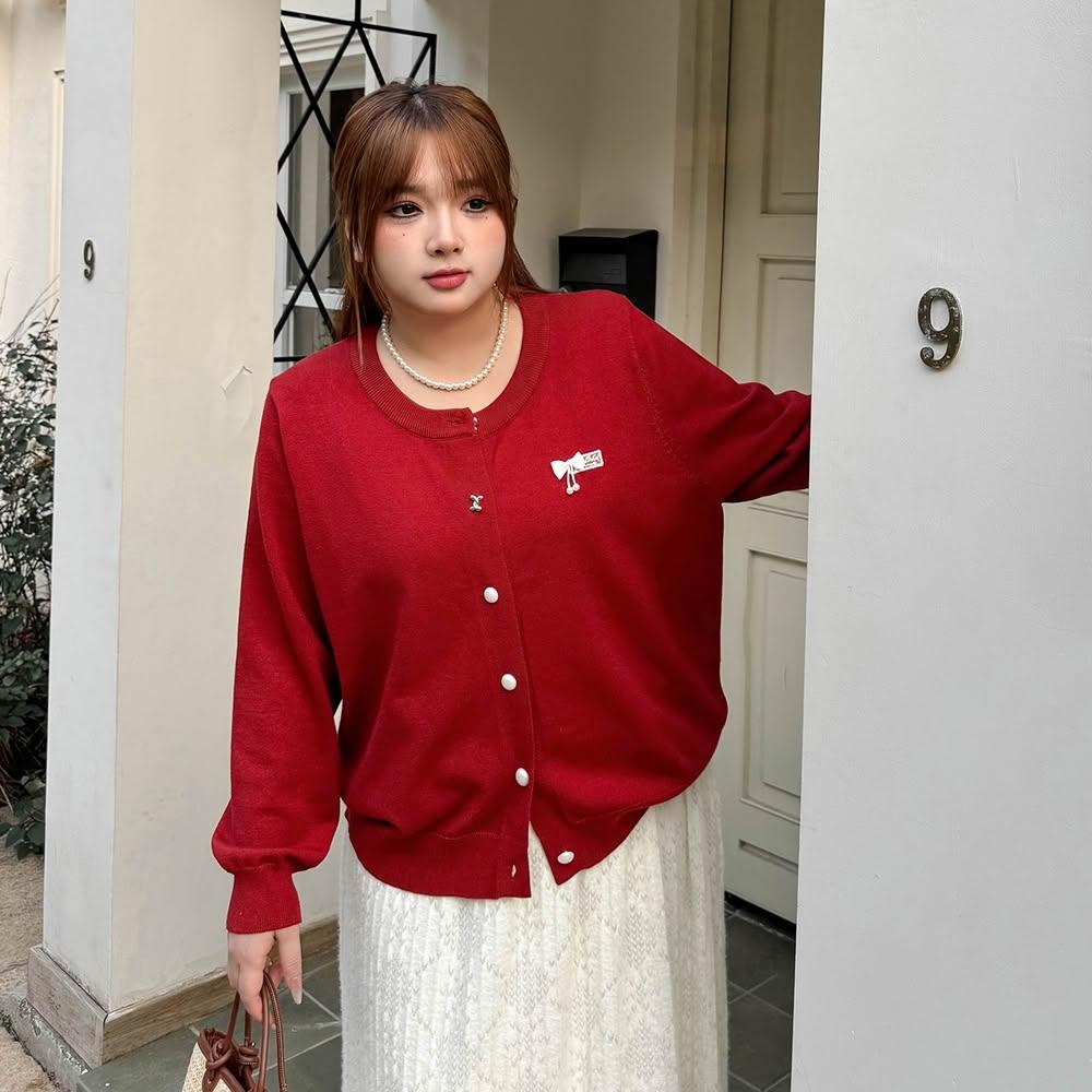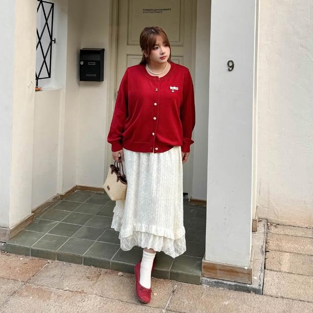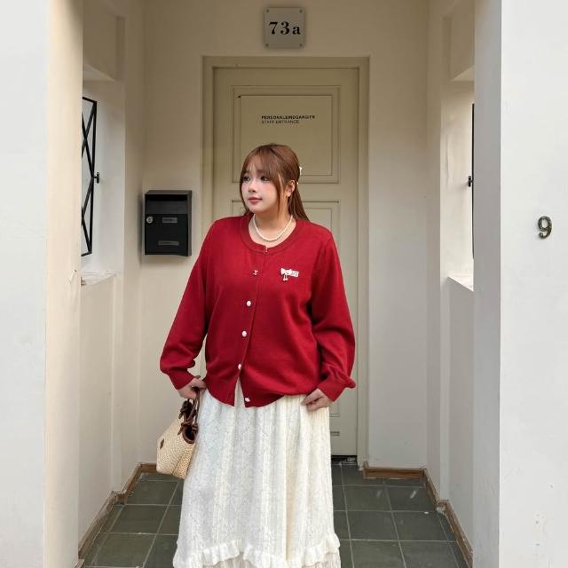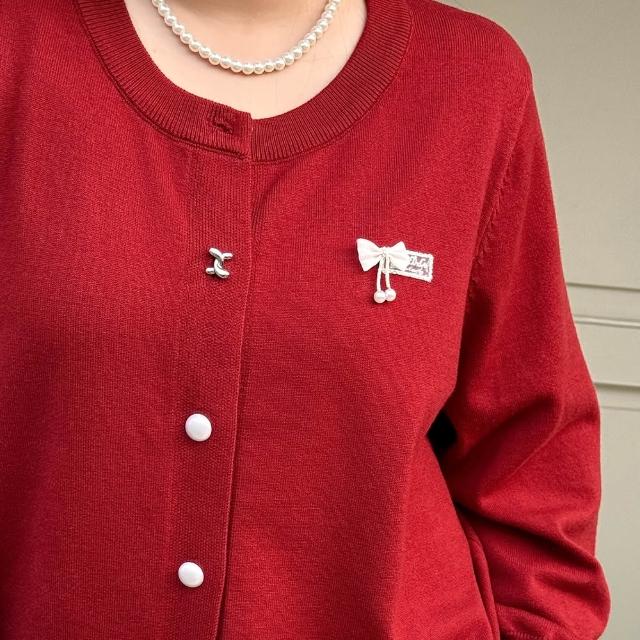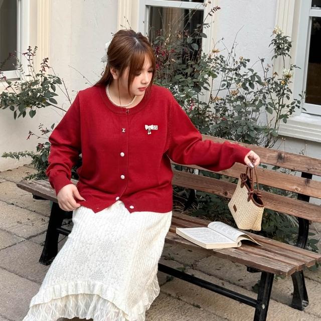 Miss38Miss38 襯膚紅 蝴蝶結珍釦小外套【EC9172】(現貨)大尺碼針織衫 高彈包芯紗 純色百搭空調衫 早春甜美寬鬆休閒