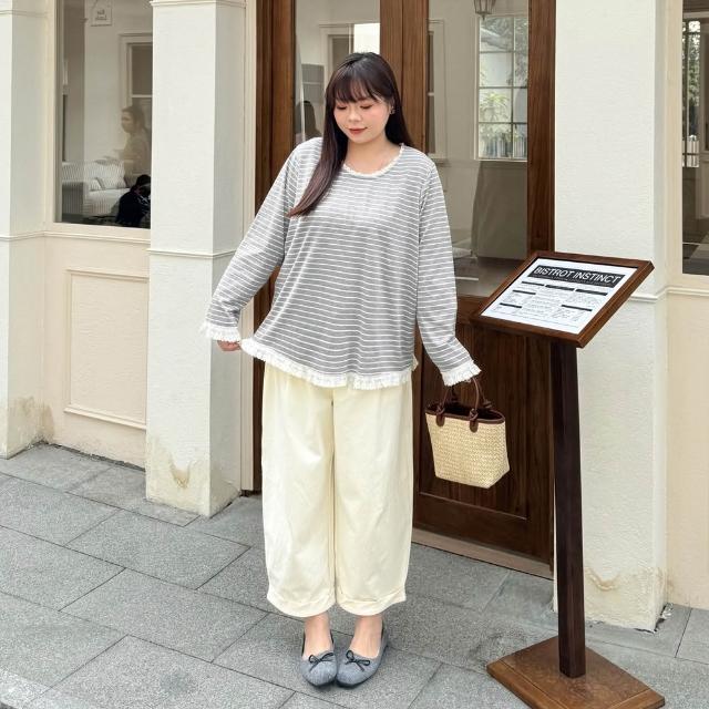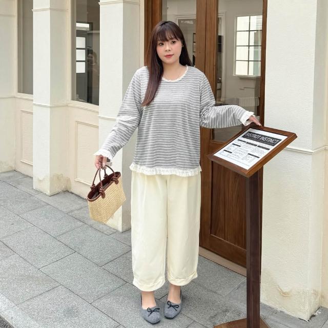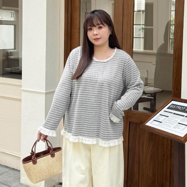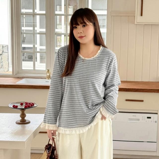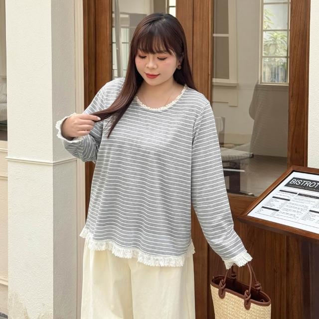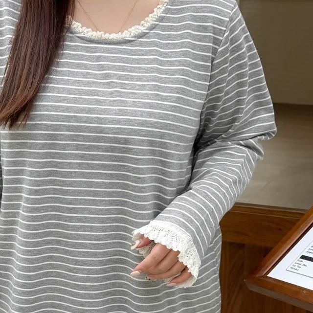 Miss38Miss38 灰x白條紋控 微甜薄長T【EC9063】(現貨)大尺碼長袖上衣 蕾絲拼接氣質款 柔美撞色 早春閉眼入基本款