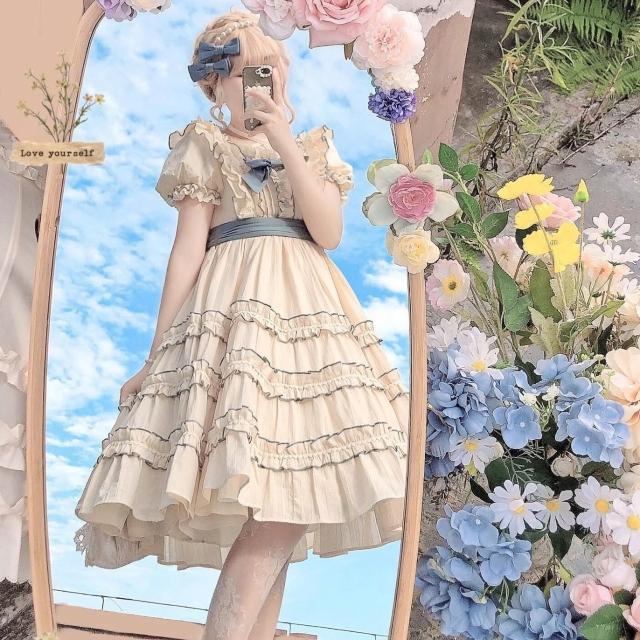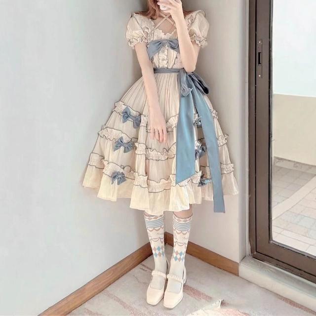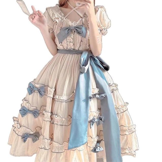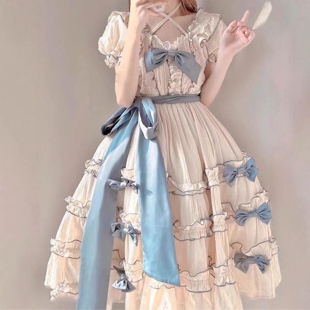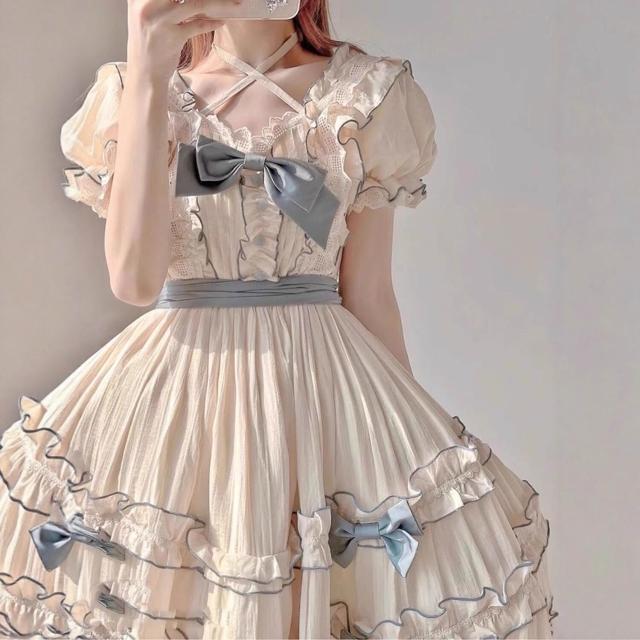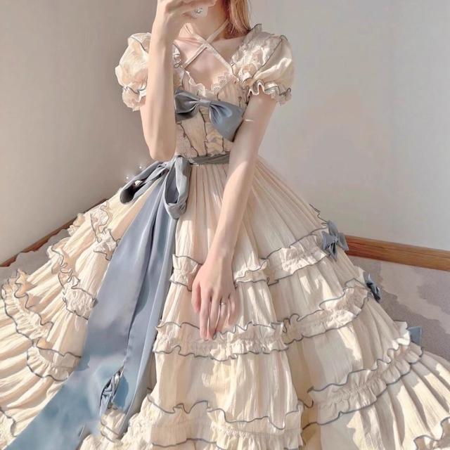 洛麗塔公主生日小禮裙蓬蓬群宮廷風收腰Lolita拼接花邊綁帶連衣裙
