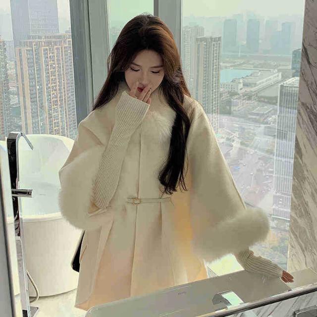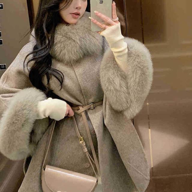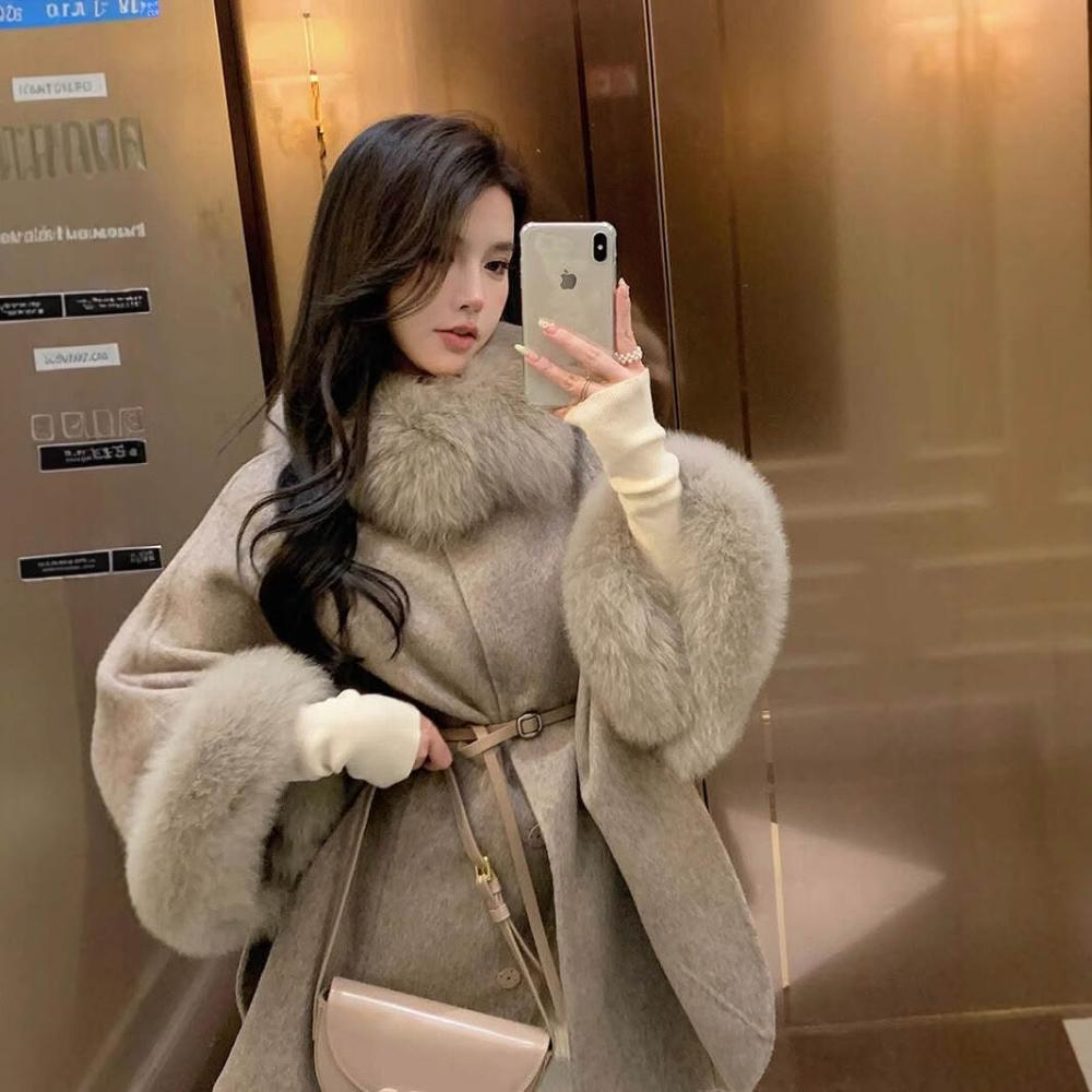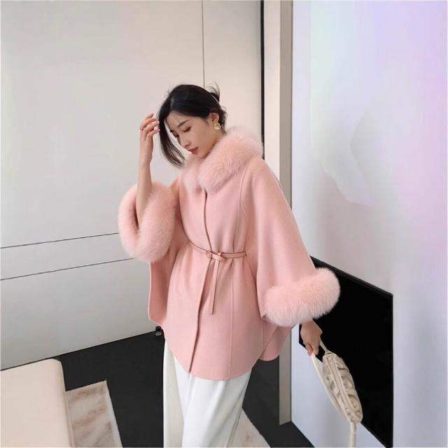 2025秋冬新款狐貍毛領高級雙面羊絨大衣女韓版羊毛呢鬥篷披肩外套