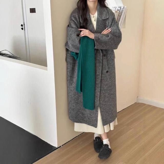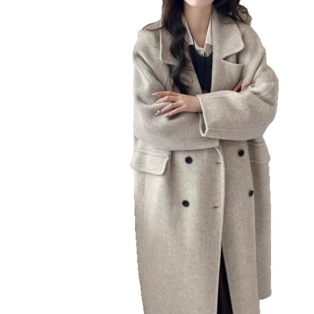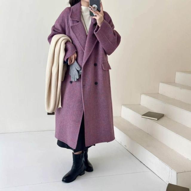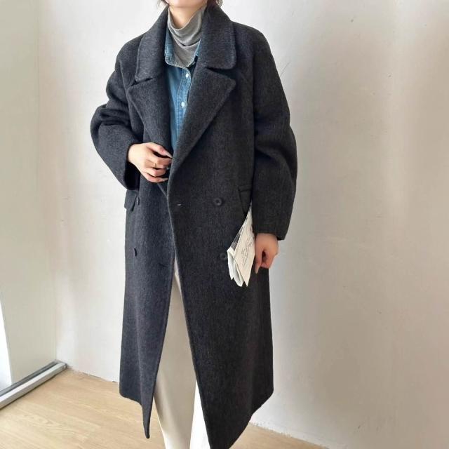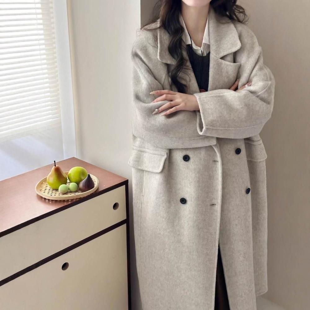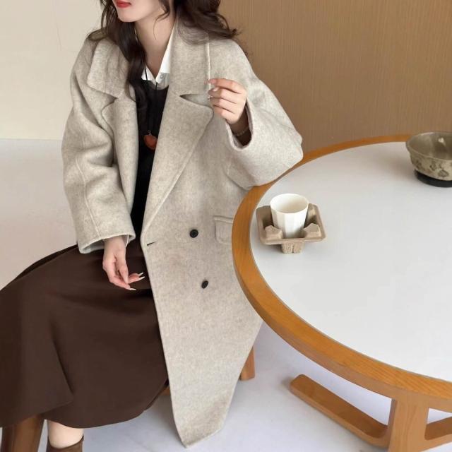 秋冬韓系西裝領高級感慵懶風雙面羊毛大衣女羊毛呢外套寬松赫本風
