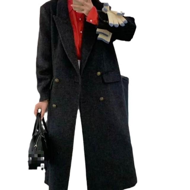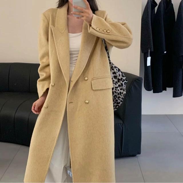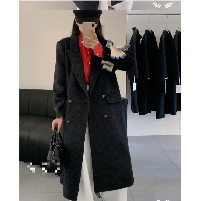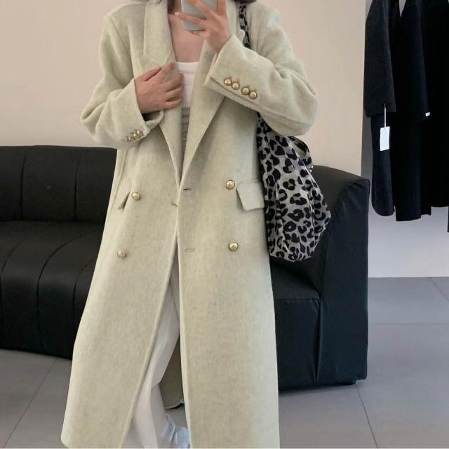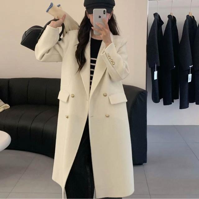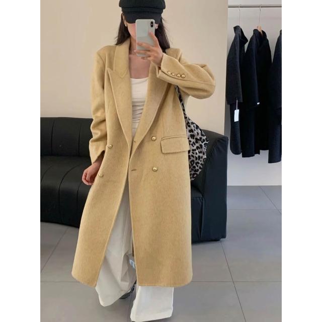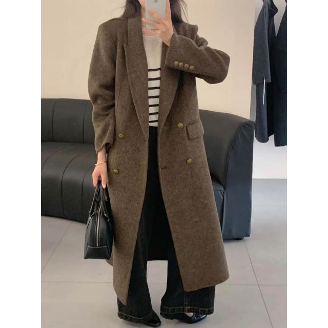 2025新款銅扣雙排扣女高級感墊肩西裝加長款韓系雙面羊毛大衣秋冬