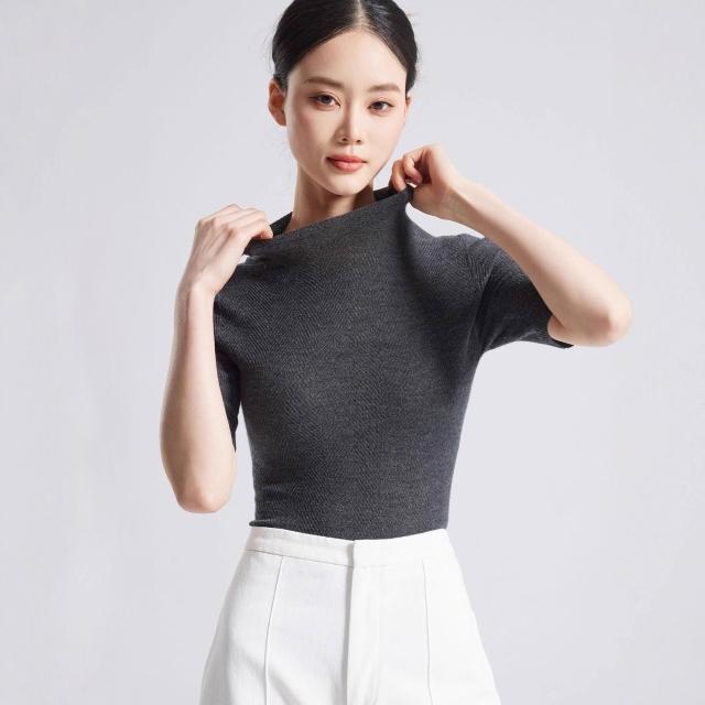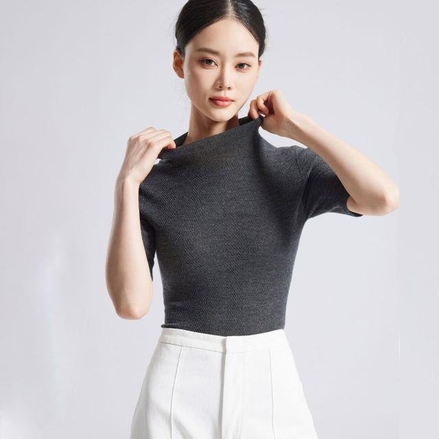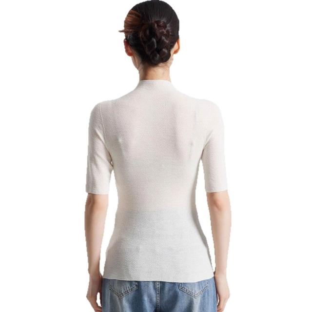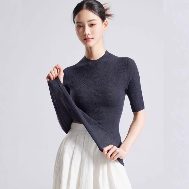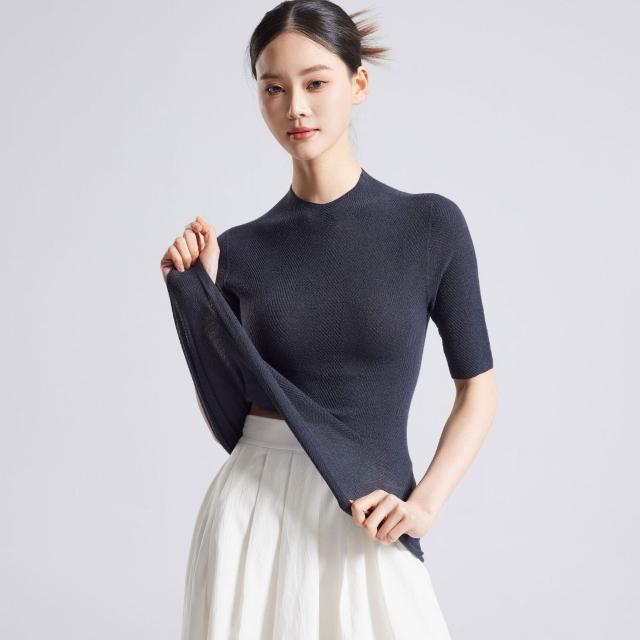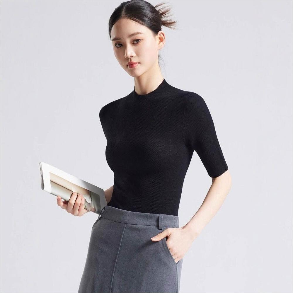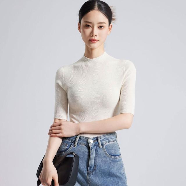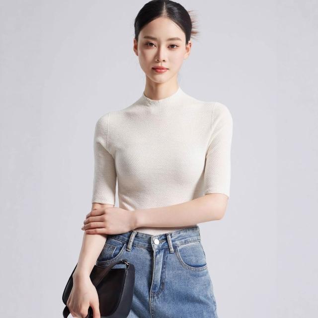 秋季無縫羊絨中袖女針織衫T恤桑蠶絲精紡羊毛半高領短袖打底衫