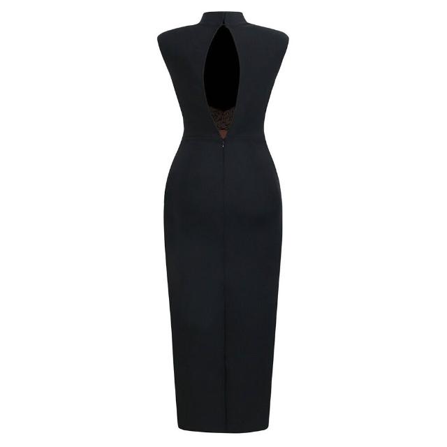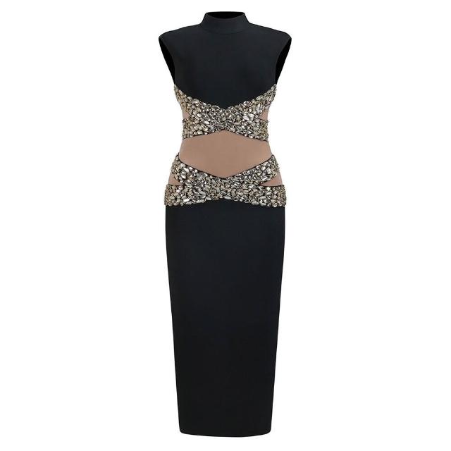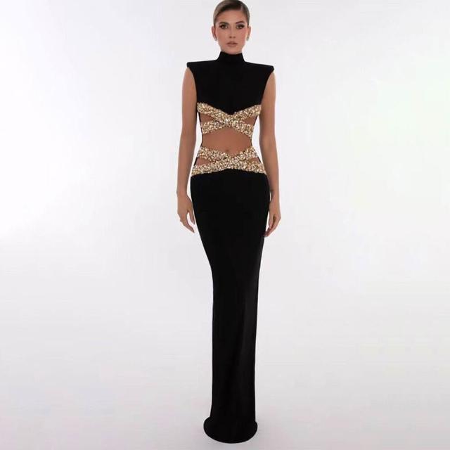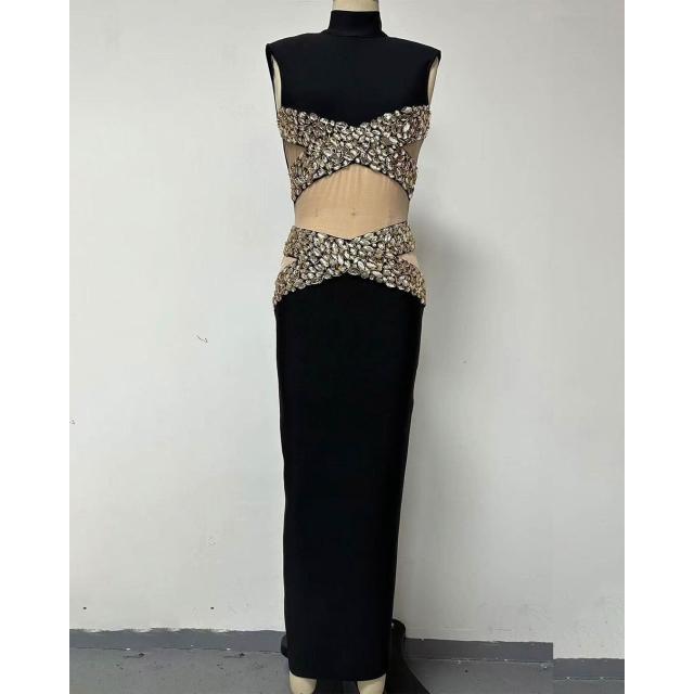 時尚女裝立領無袖重工水鉆網紗拼接長款連衣裙優雅宴會晚禮服