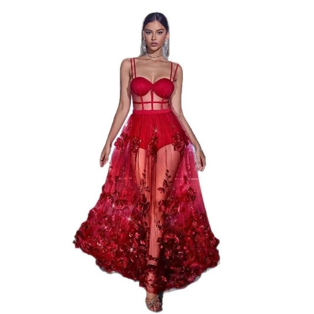 性感吊帶網紗半透宴會晚禮服藤蔓圖案無袖派對長裙