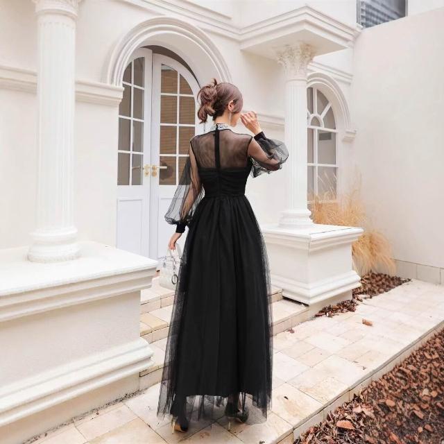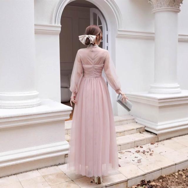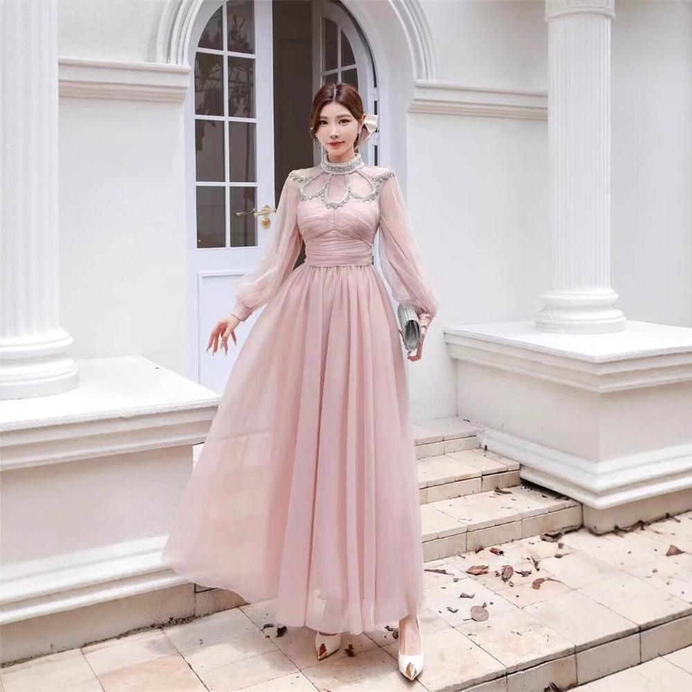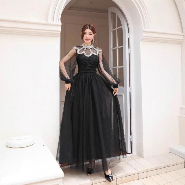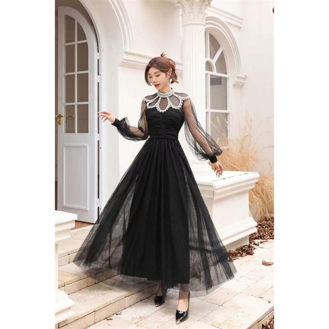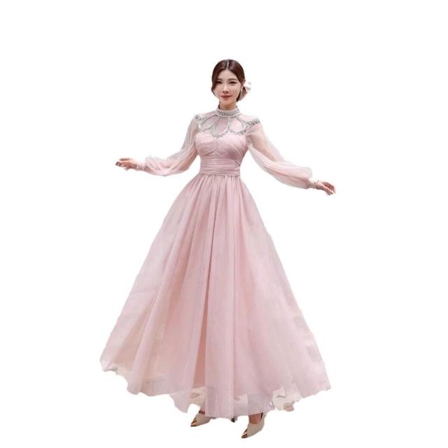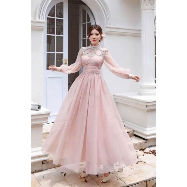24秋冬重工名媛鉆飾網紗仙氣大擺連衣長裙主持人宴會禮服