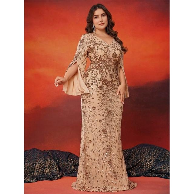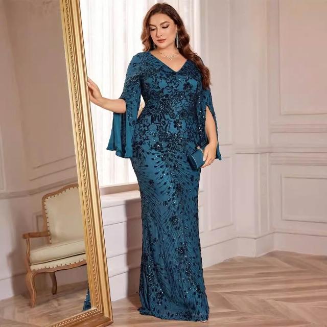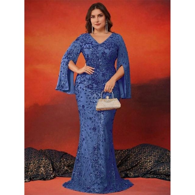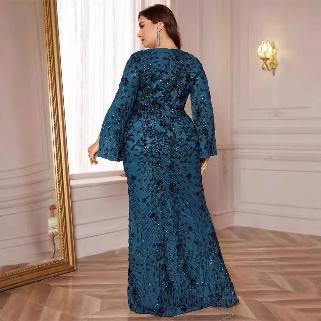 大碼新款亮片長袖晚禮服女宴會氣質修身魚尾裙長款敬酒連衣裙