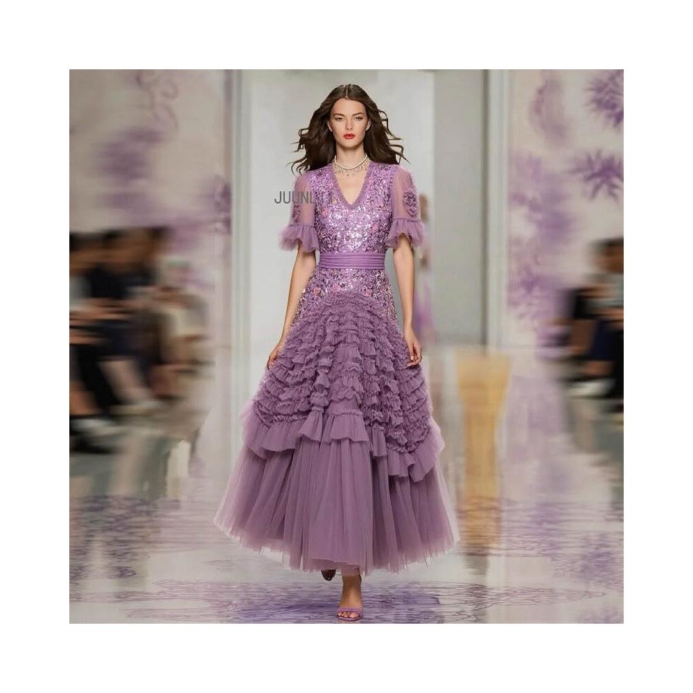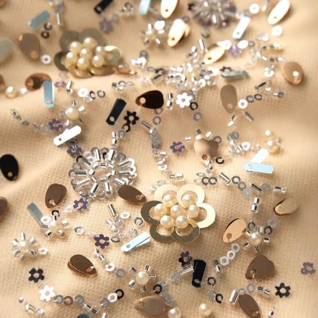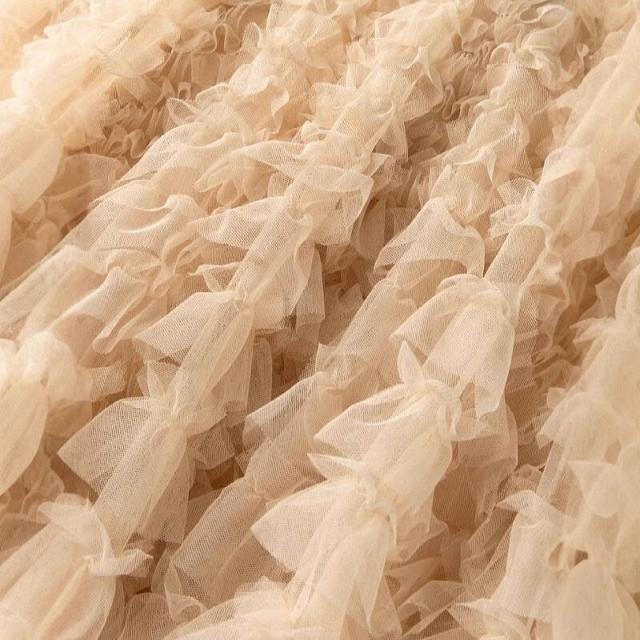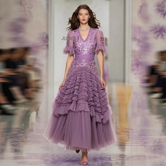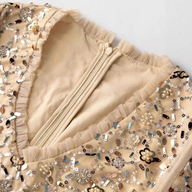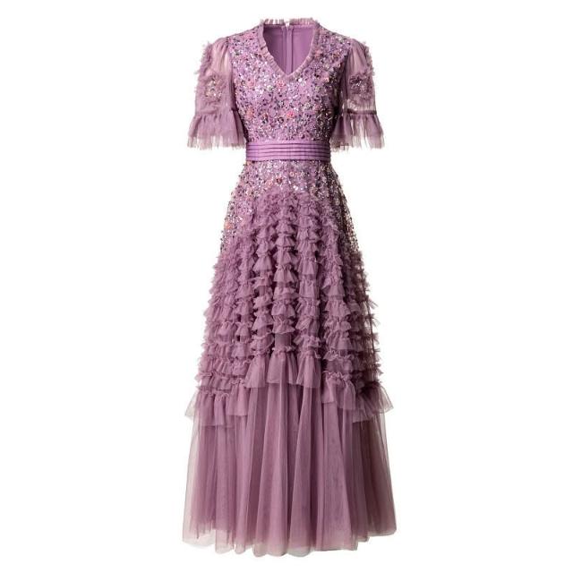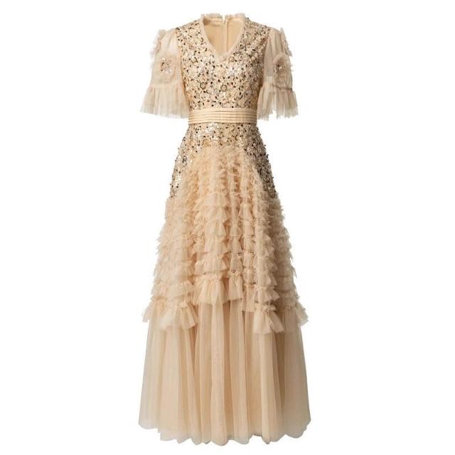 高級感晚裝宴會禮服V領網紗重工刺繡亮片木耳蓬蓬長裙大擺連衣裙