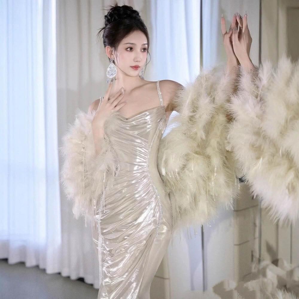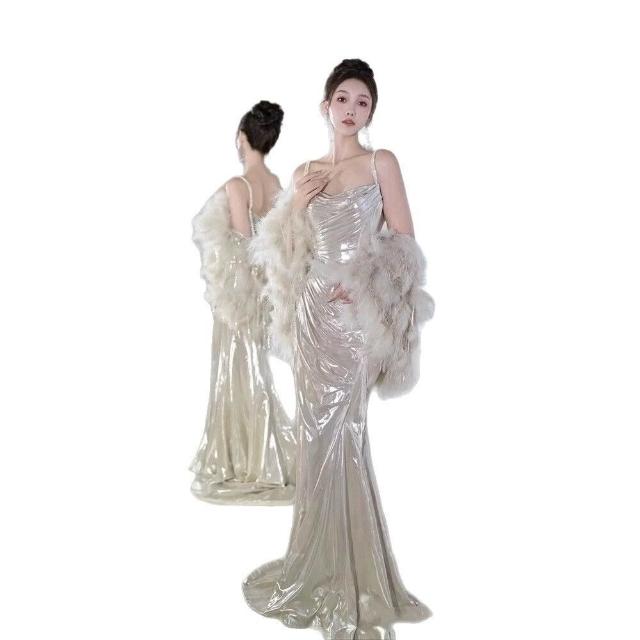 輕奢亮面吊帶晚禮服名媛氣質生日party長款禮服2025新款修身顯瘦