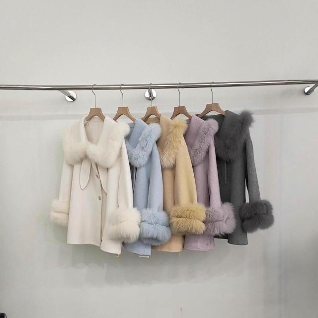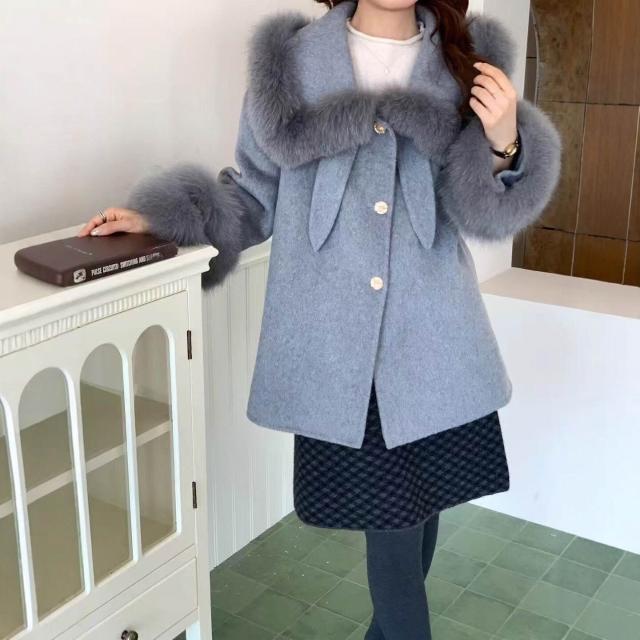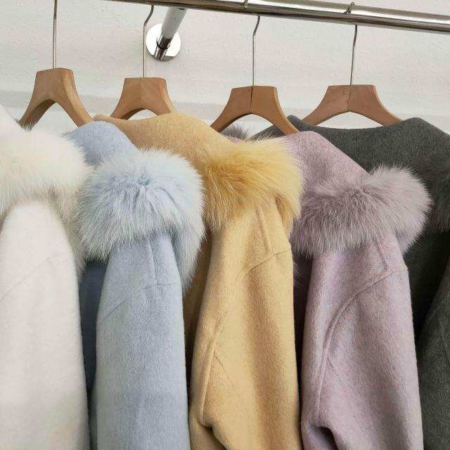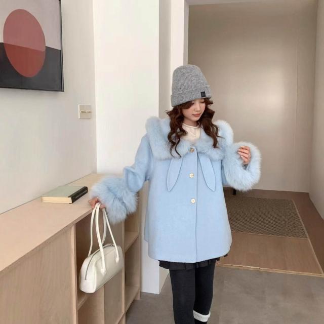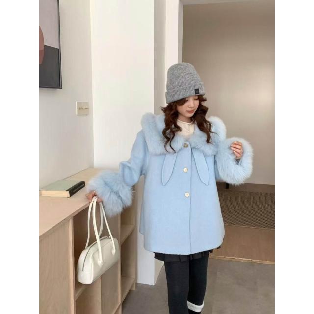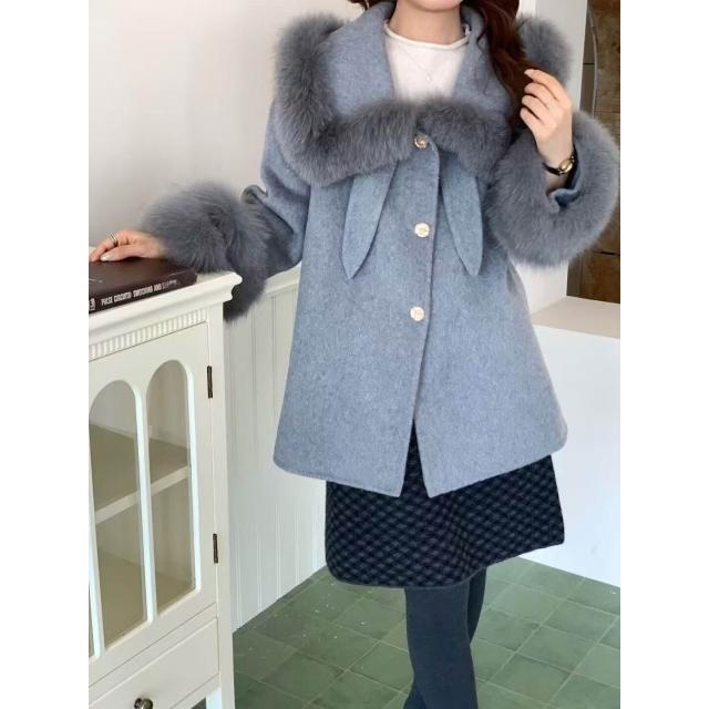 2025高品質韓版百搭真毛領翻領雙面羊毛大衣小個子毛呢外套女