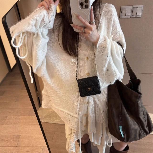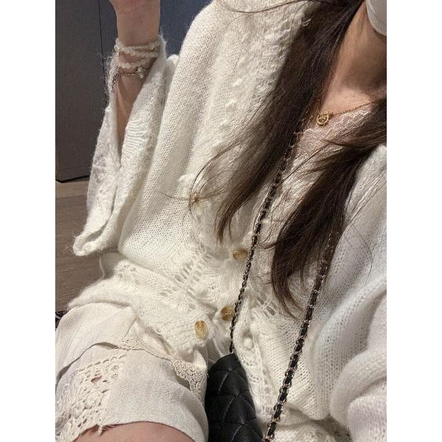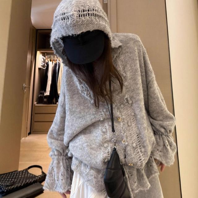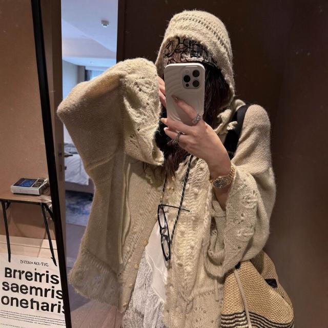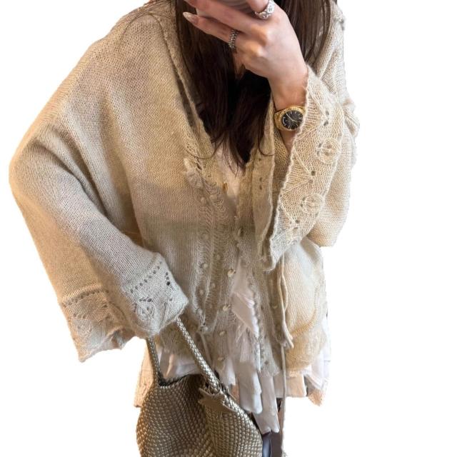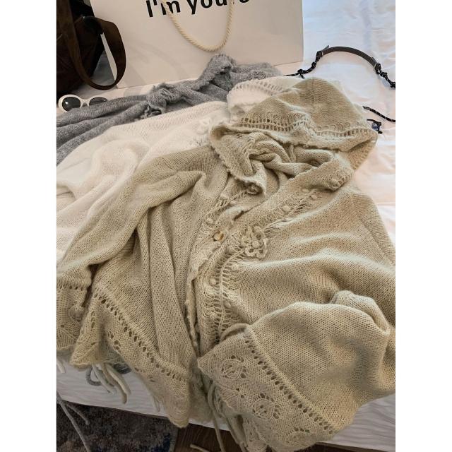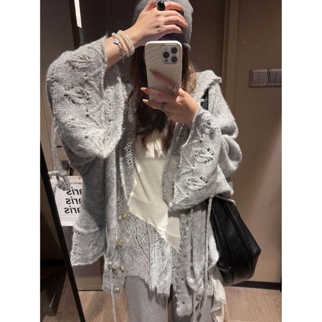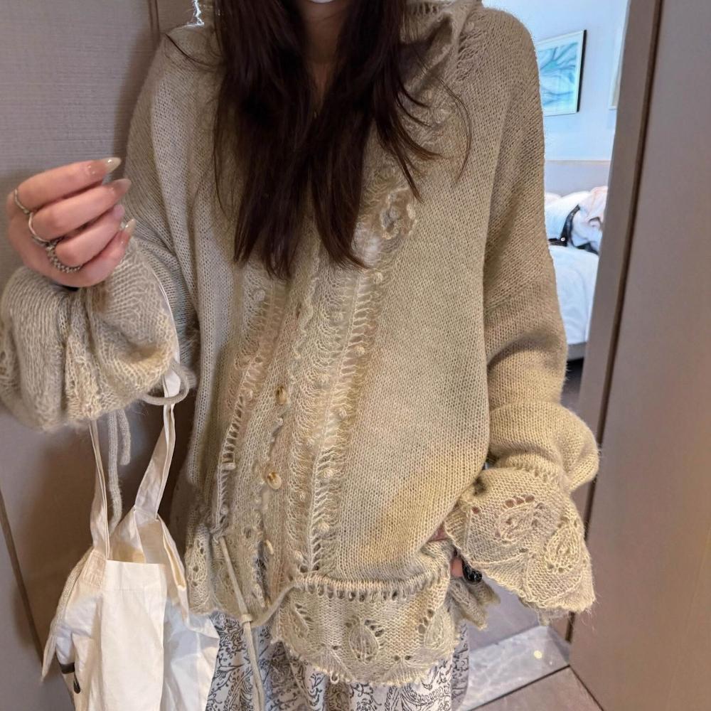 重工韓系慵懶松弛感鉤花針織連帽大開衫女薄款羊毛針織衫毛衣