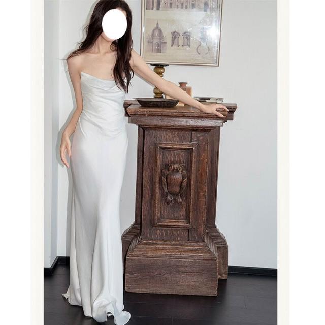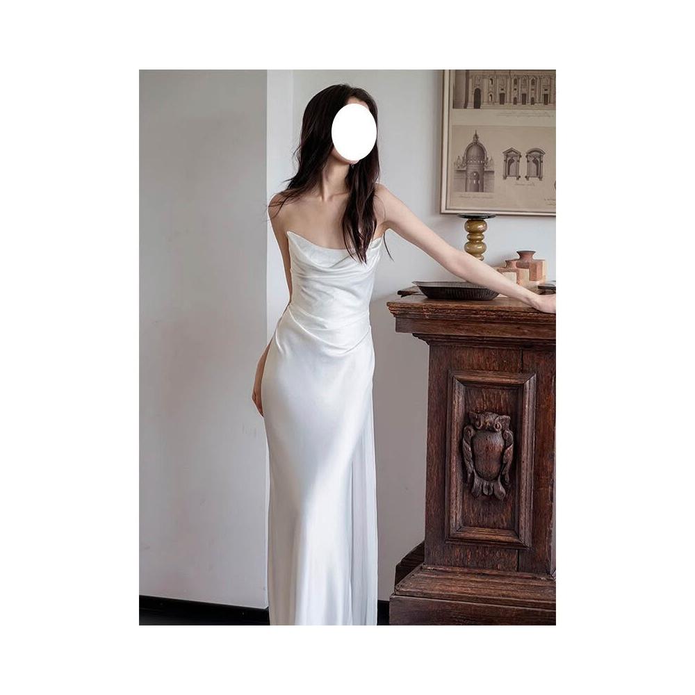 法式氣質新娘白色領證訂婚禮服裙蕩領吊帶連衣裙設計感宴會晚禮服