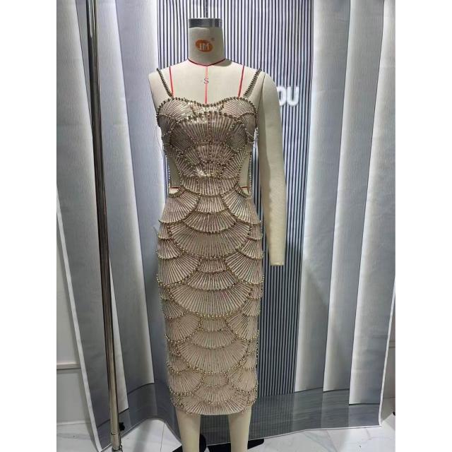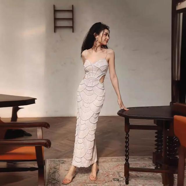 精美亮片釘珠露腰吊帶長款晚宴禮服名媛生日派對連衣裙