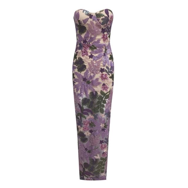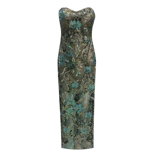 2025新款時尚性感漏肩長禮服立體網紗色繡花亮片修身連衣裙