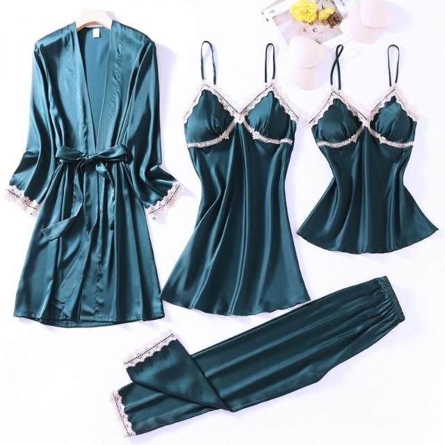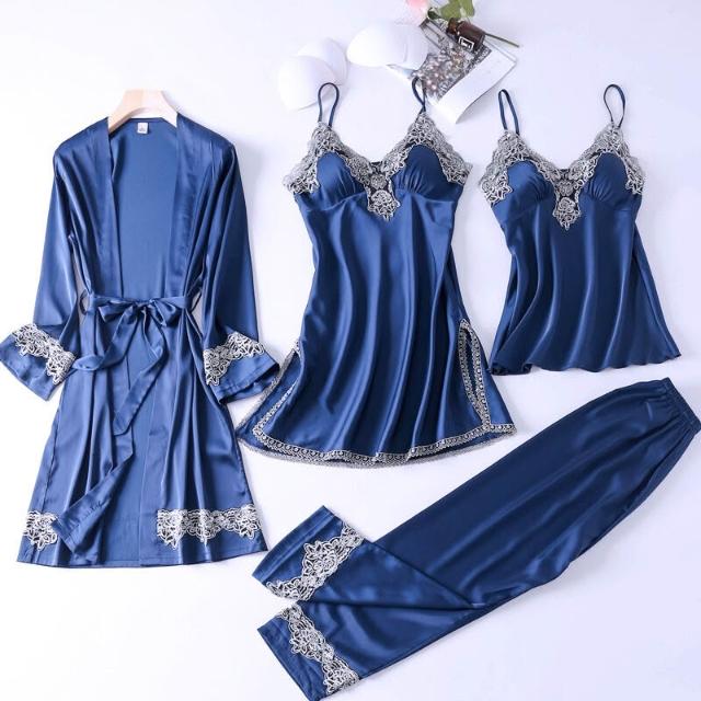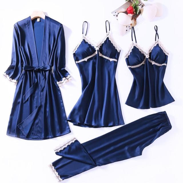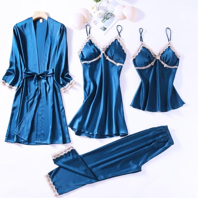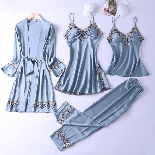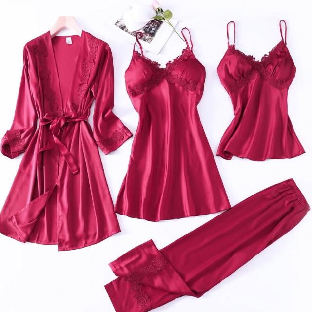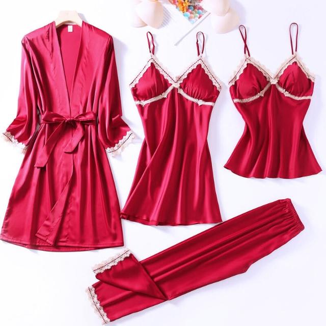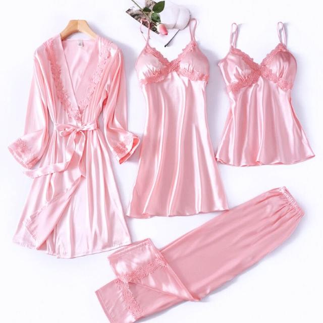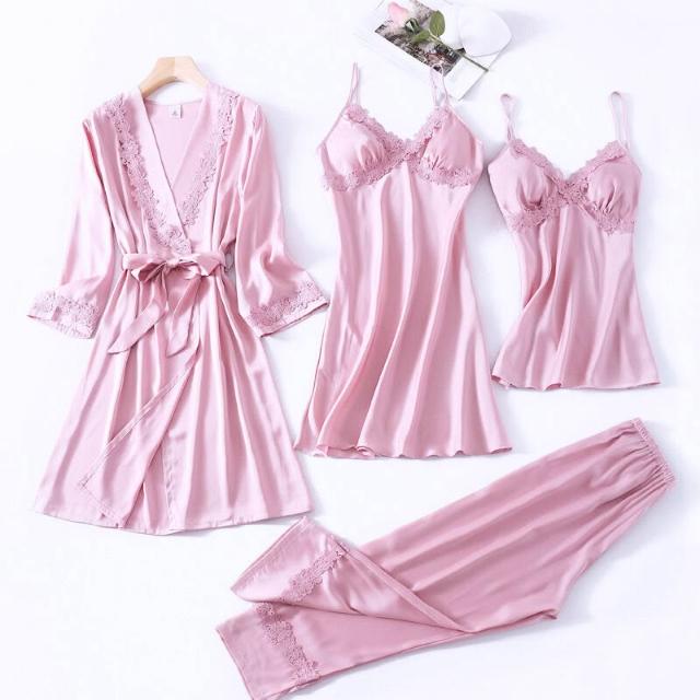 睡衣女夏季薄款性感四件套裝睡裙吊帶睡袍長袖長褲冰絲春秋家居服