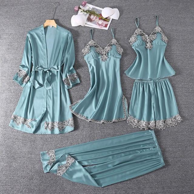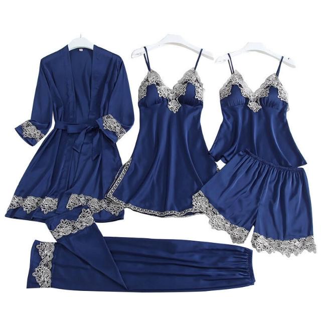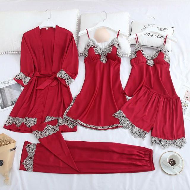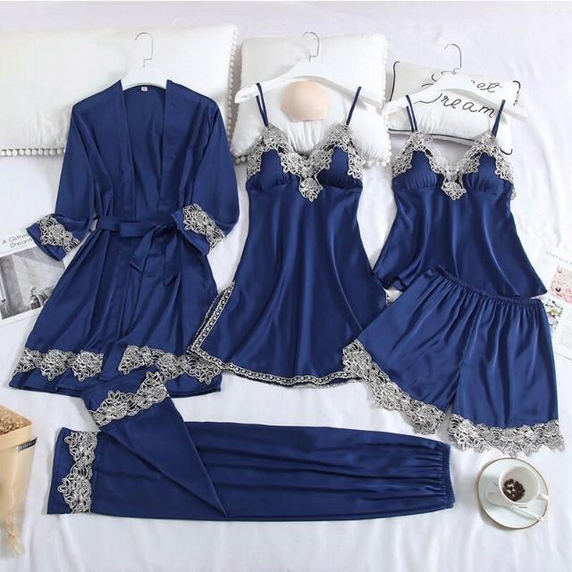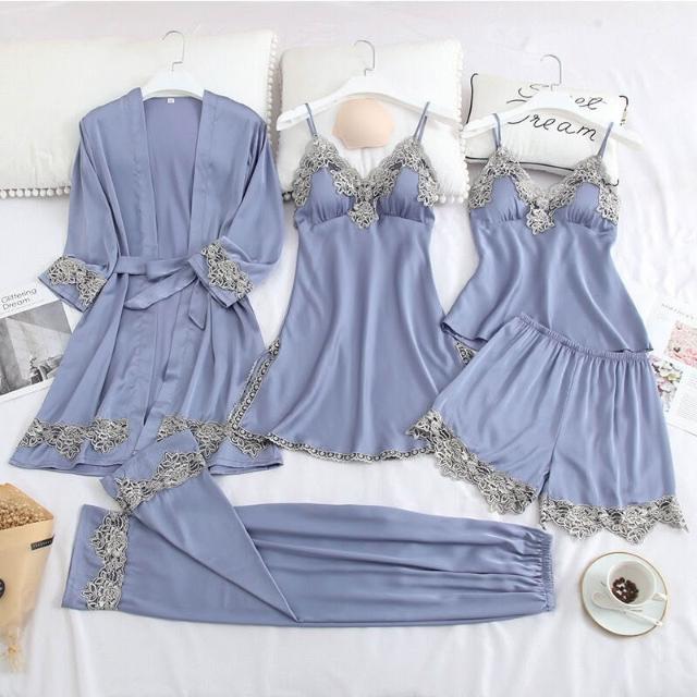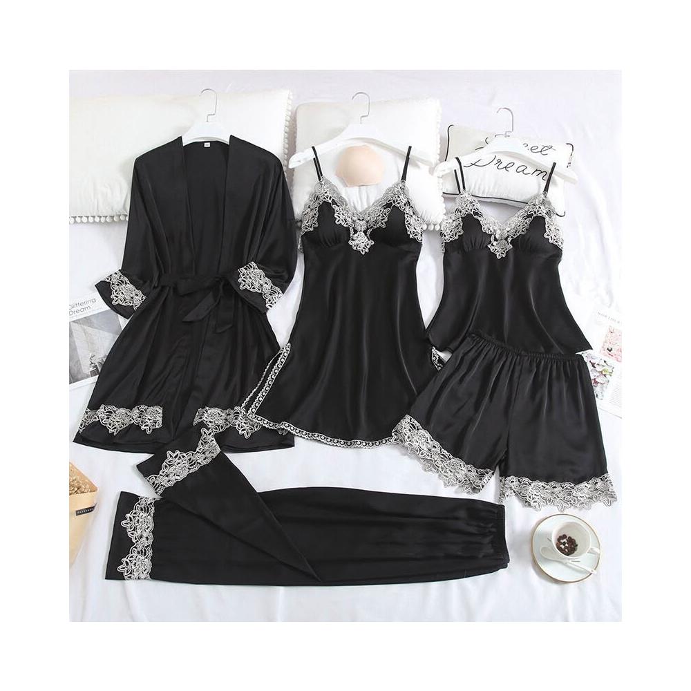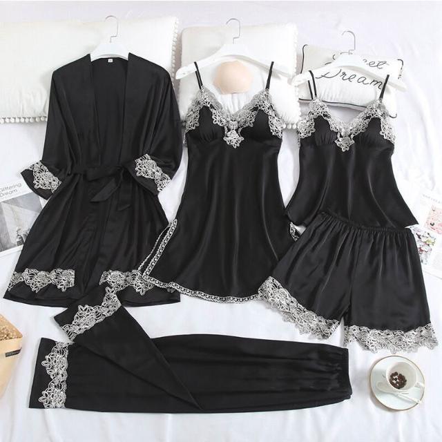 2024春夏款吊帶睡衣五件套 性感透氣女士睡衣 緞面雪紡舒適家居服