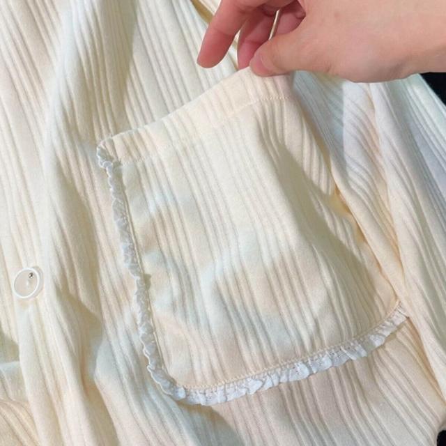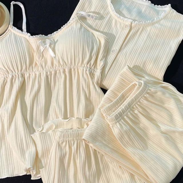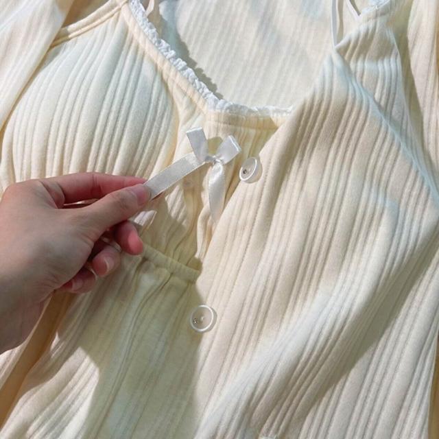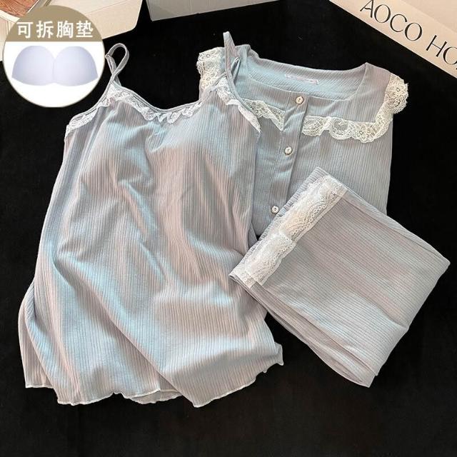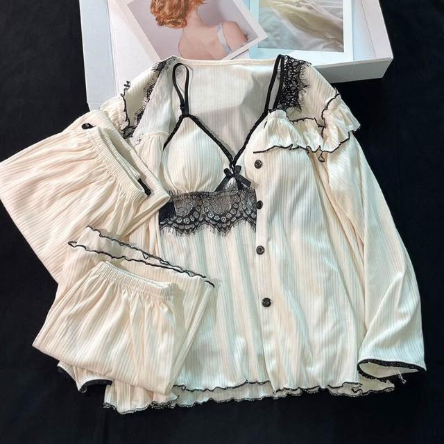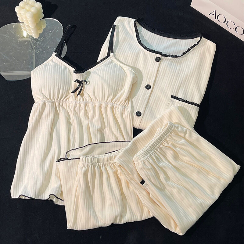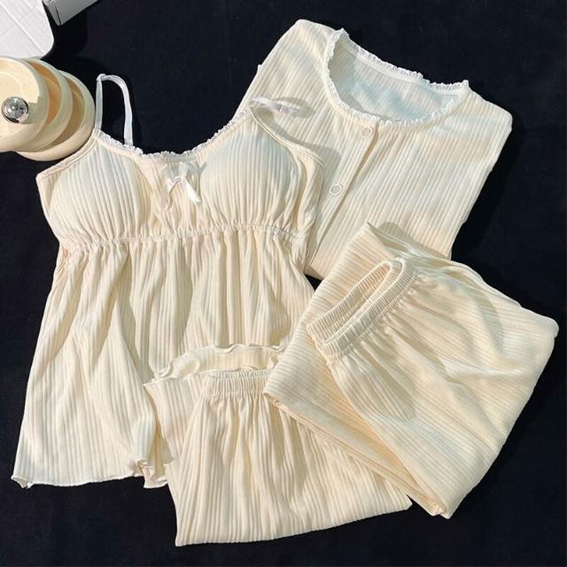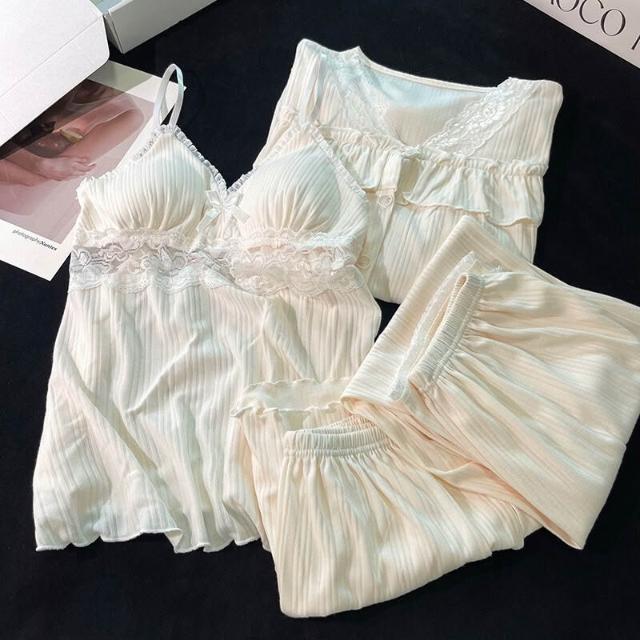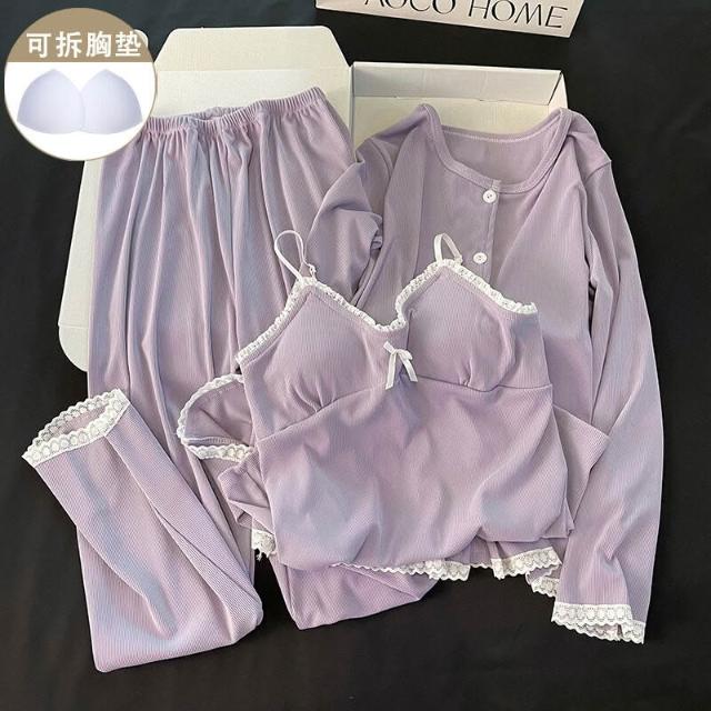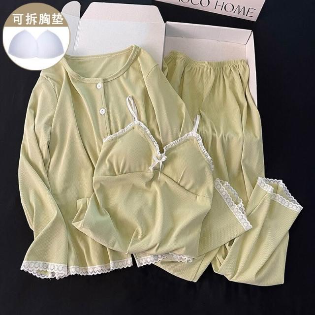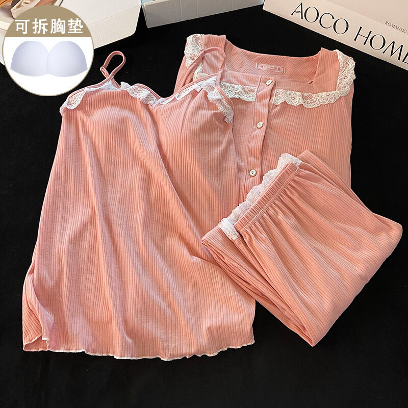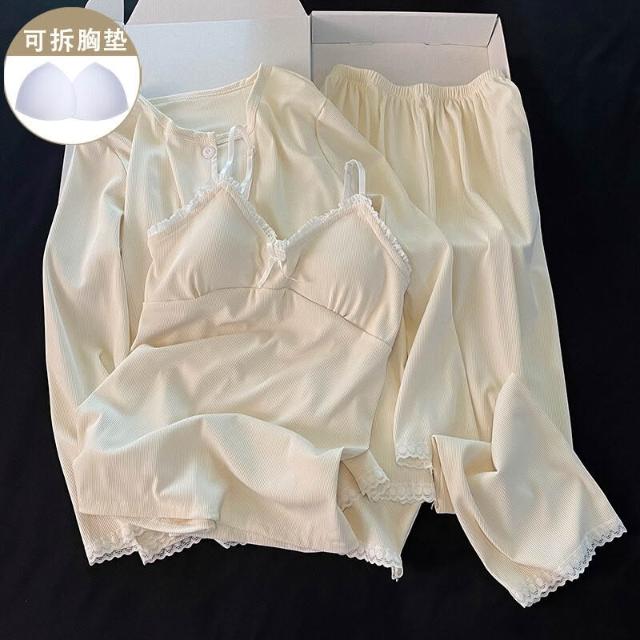 睡衣女夏季純棉吊帶性感長袖帶胸墊杏色春秋四三件套裝冬天家居服