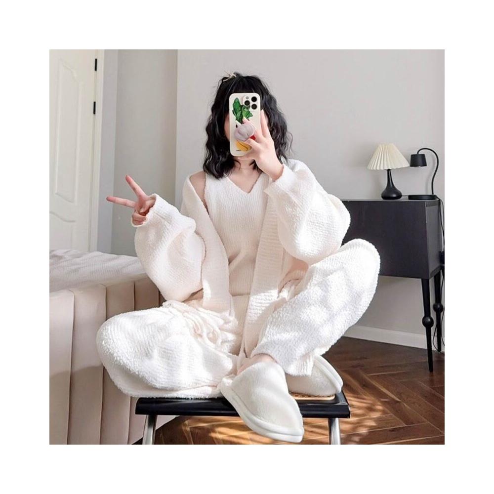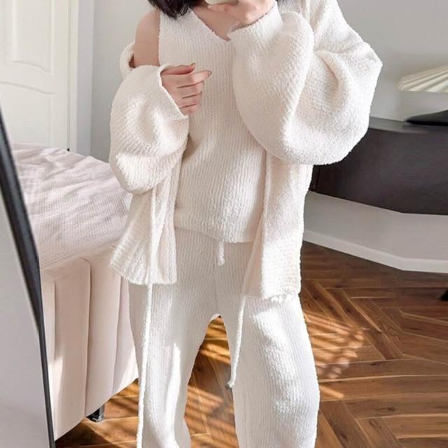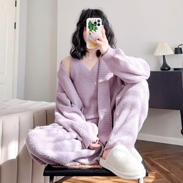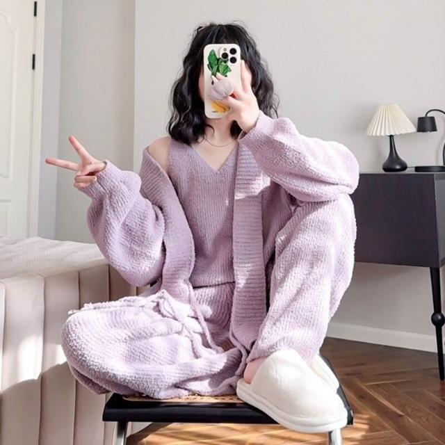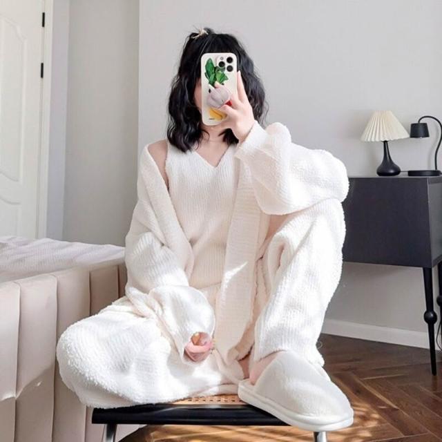 簡約軟綿綿睡衣女秋冬季睡袍吊帶長褲三件套性感保暖家居服套裝