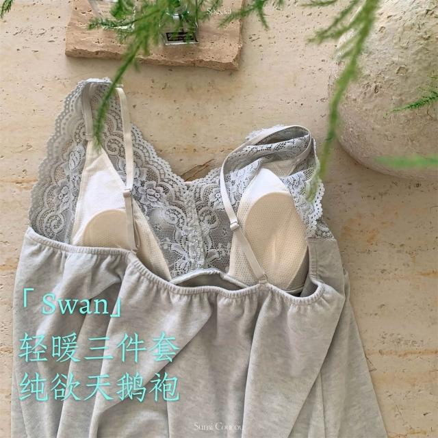 天鵝袍睡衣秋冬三件套睡裙女性感帶胸墊睡袍家居服法式蕾絲秋冬季