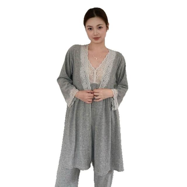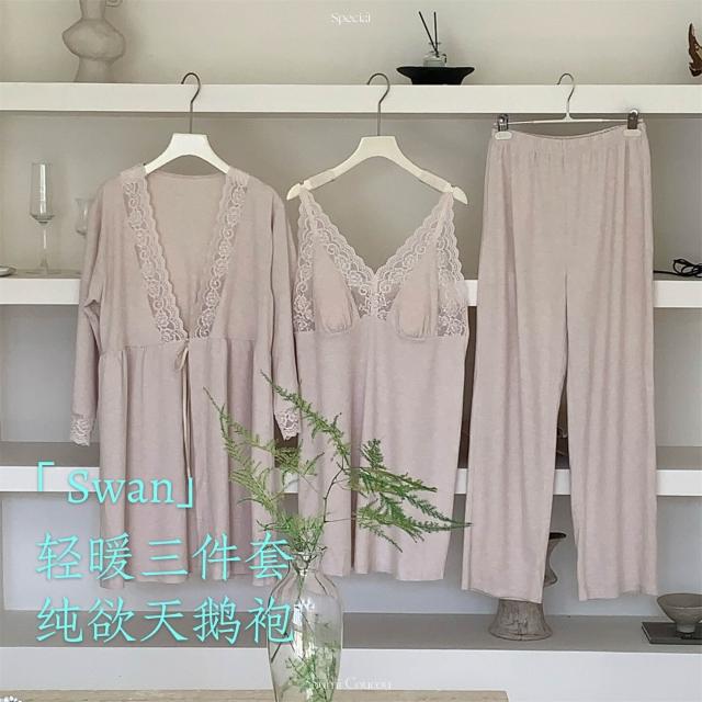 天鵝袍睡衣秋冬三件套睡裙女性感帶胸墊睡袍家居服法式蕾絲秋冬季
