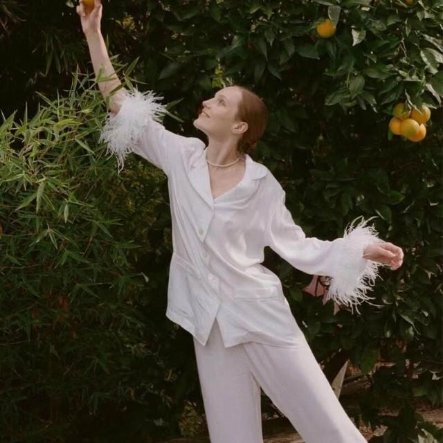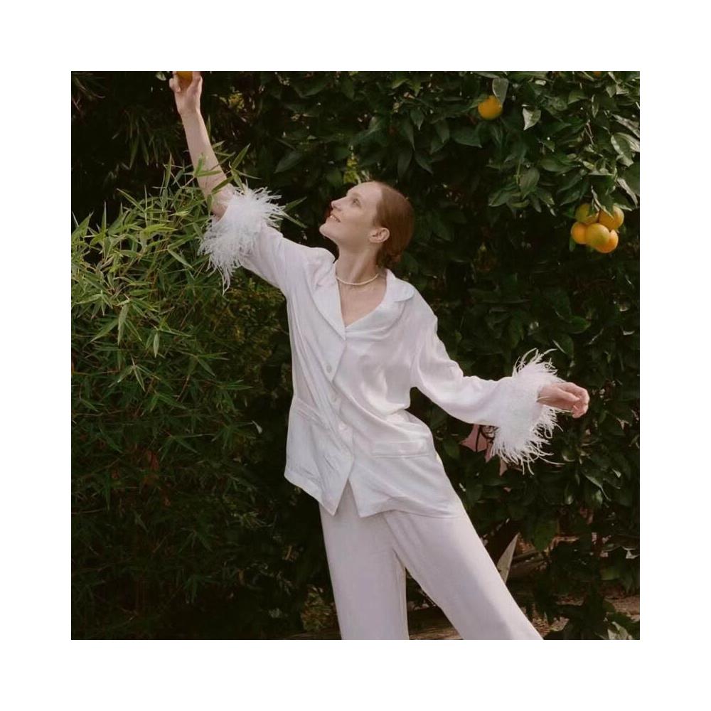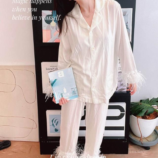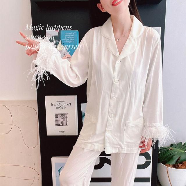 白色羽毛ins棉綢款性感睡衣女春秋薄夏季大碼家居服套裝寬松套裝