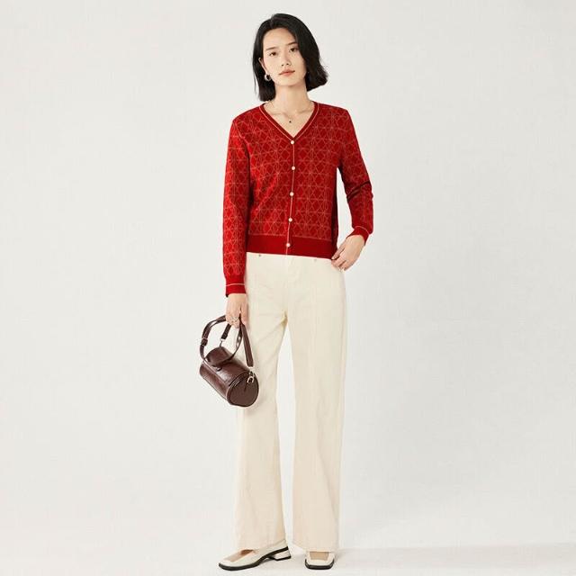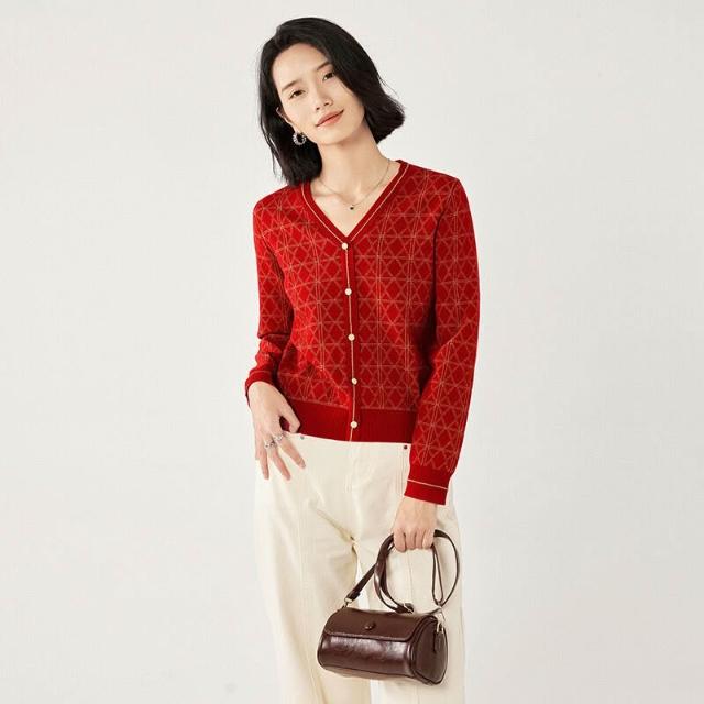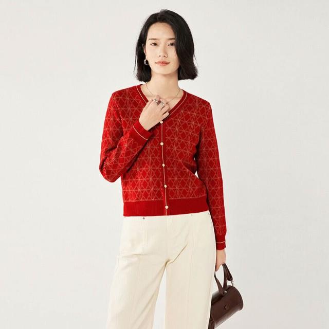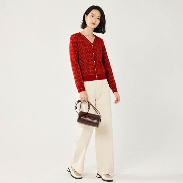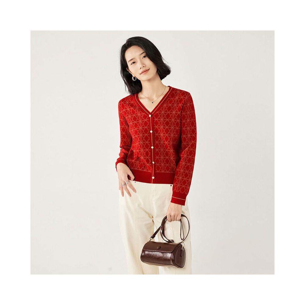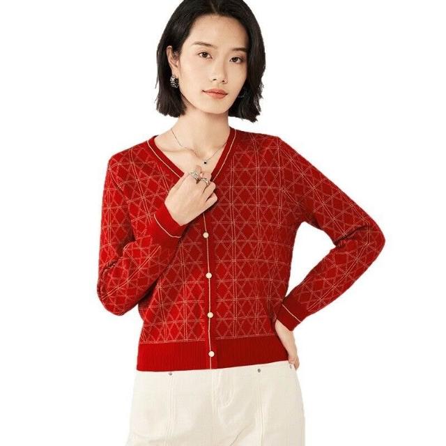 法式小香風羊毛混紡v領針織衫女 秋季新款金銀線提花顯瘦修身上衣