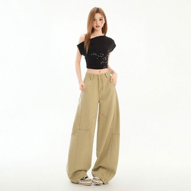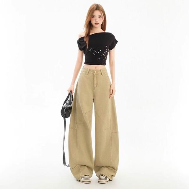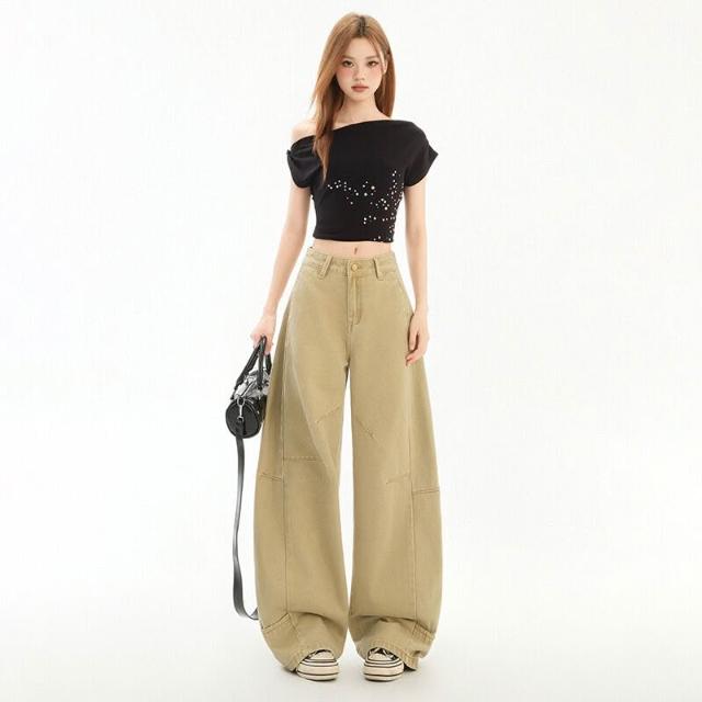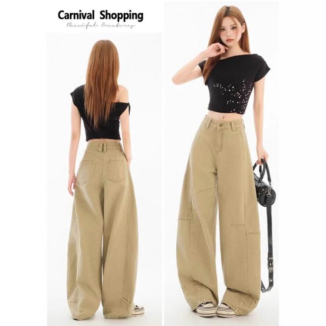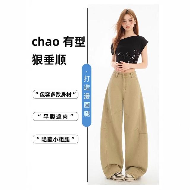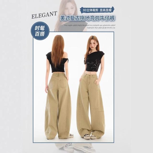 比比優精選 卡其色彎刀牛仔褲女2025秋冬新款寬松垂感高腰美式直筒闊腿褲