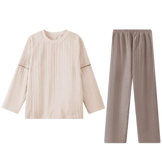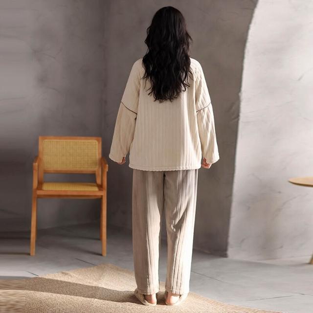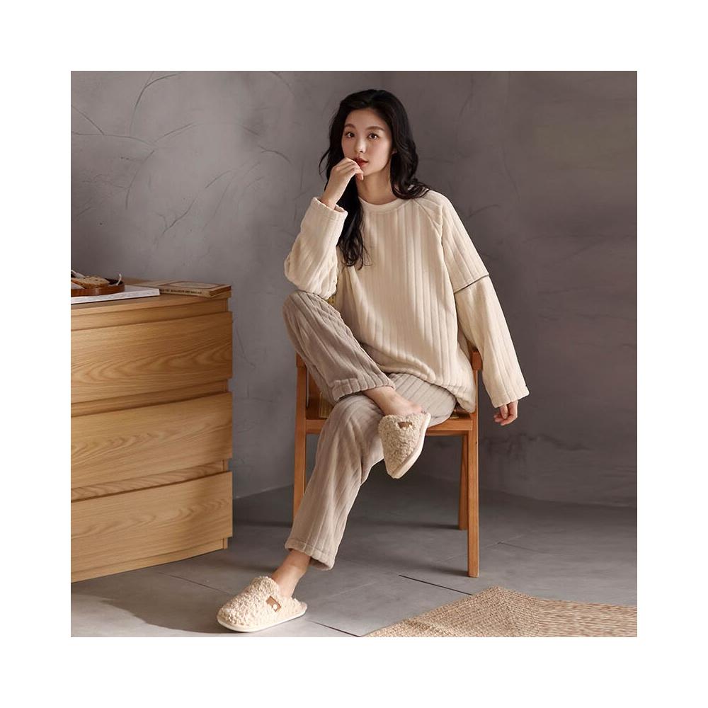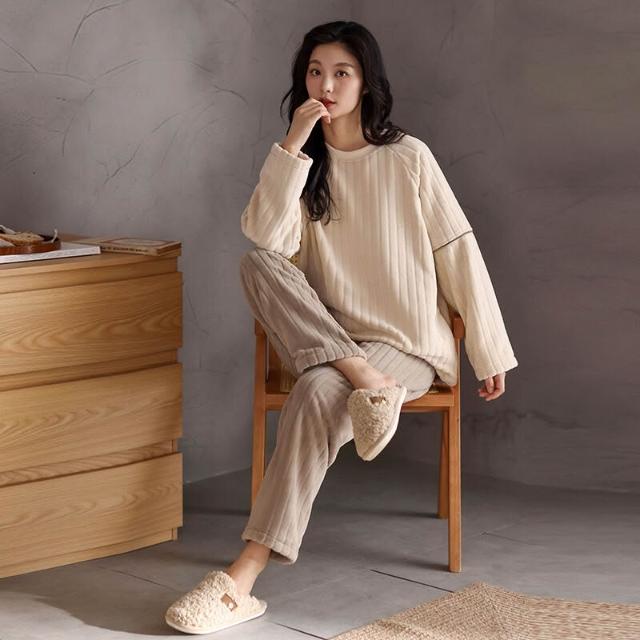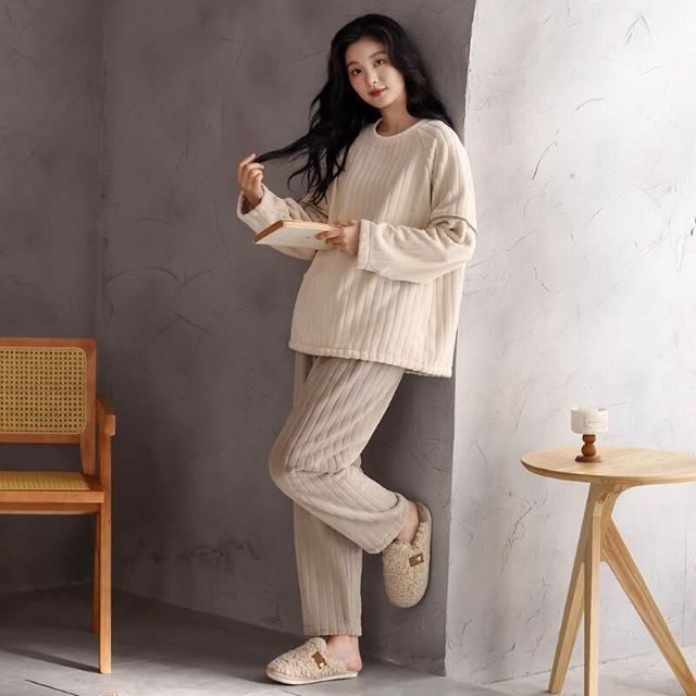 比比優 睡衣女冬季珊瑚絨圓領套頭加絨加厚防寒保暖法蘭絨家居服套裝秋冬