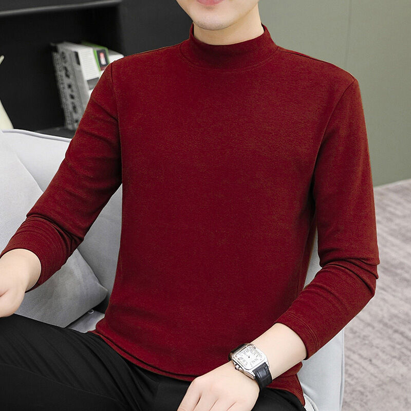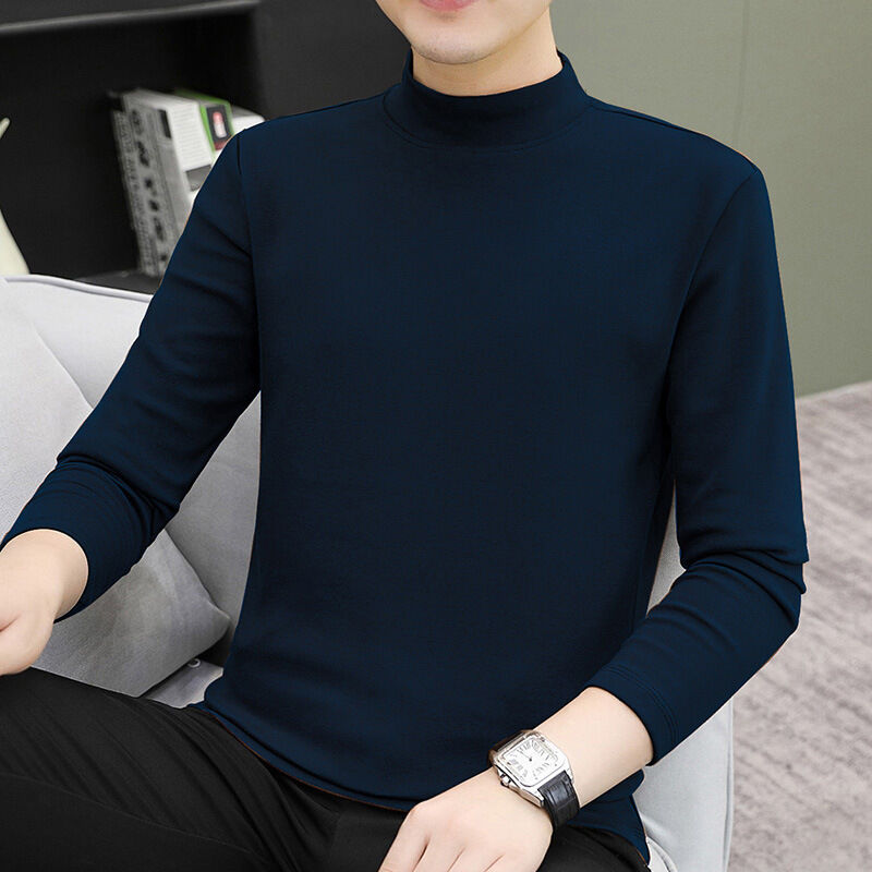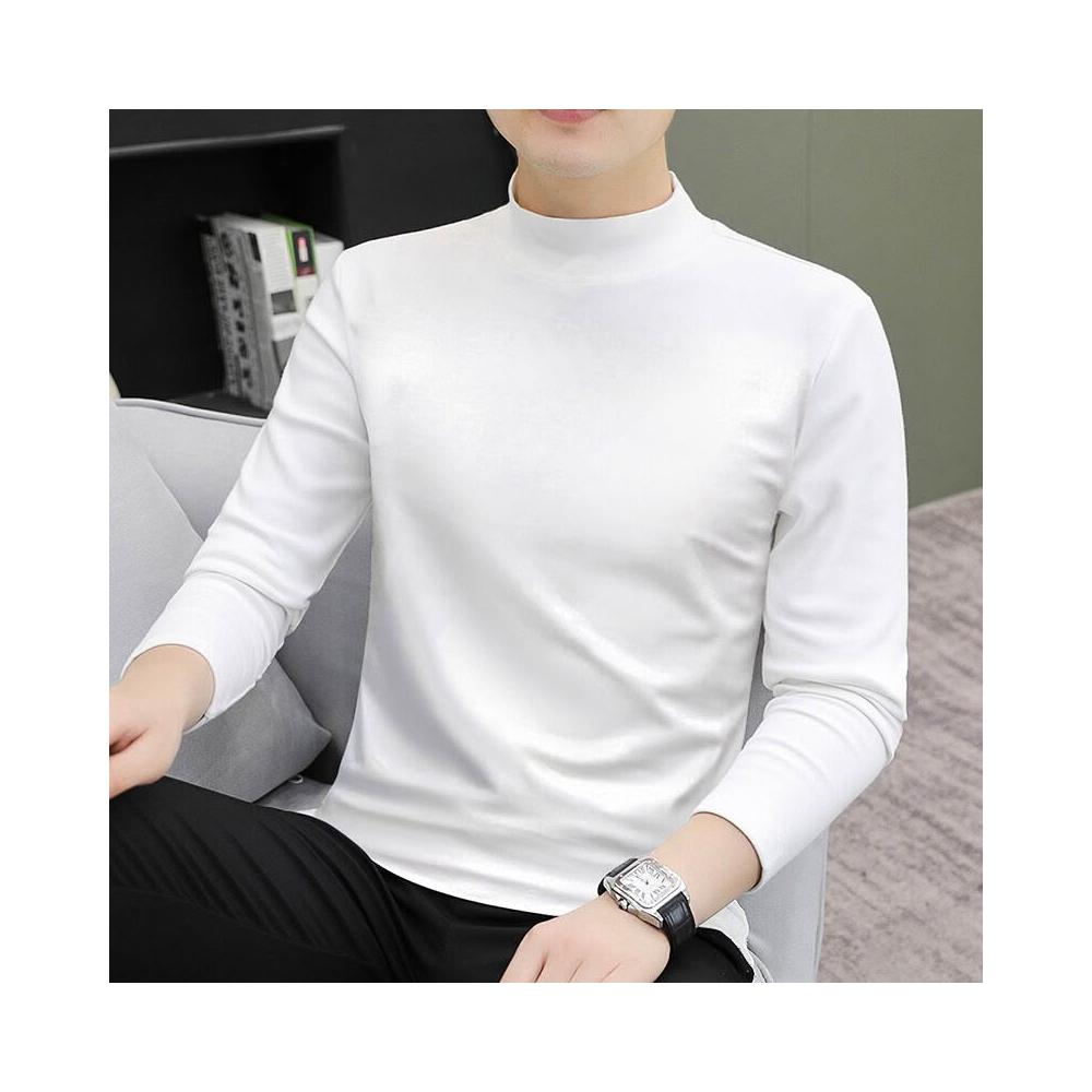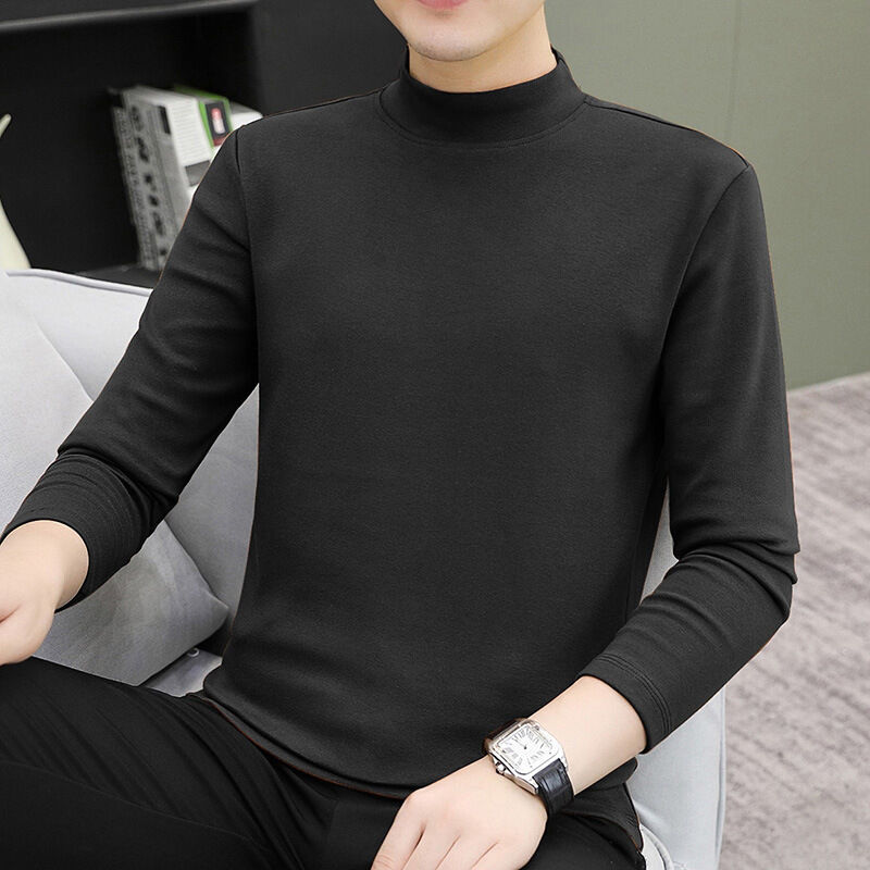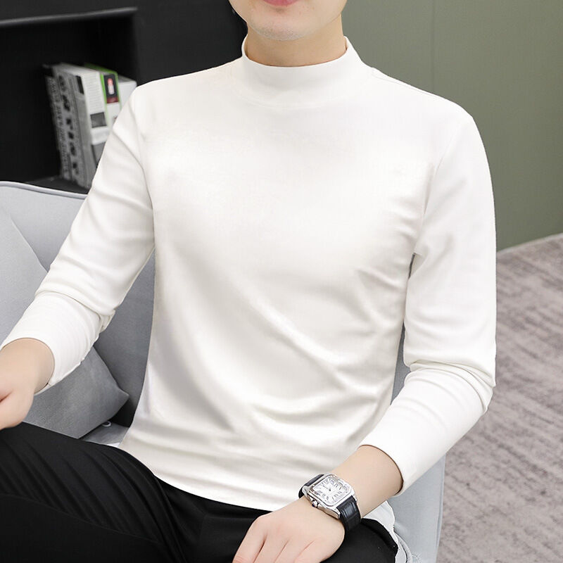 比比優 中領男士長袖秋冬潮流修身內搭白色純棉半高領T恤打底衫秋衣體恤