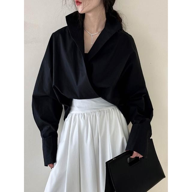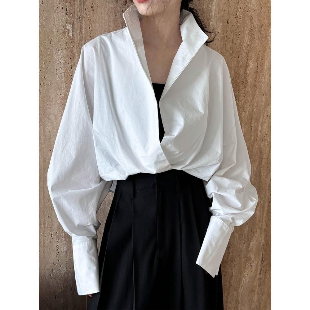 比比優 廓形疊穿立領深V領白襯衫女慵懶蝙蝠袖氣質大版通勤襯衣