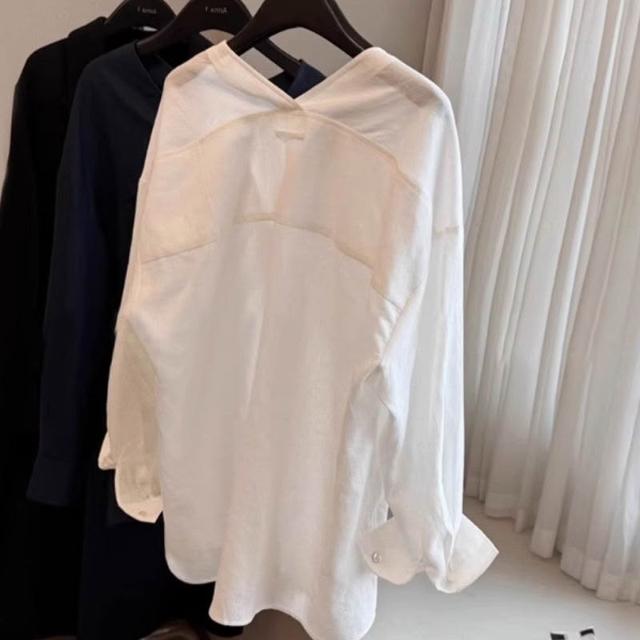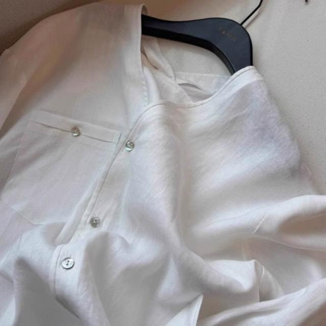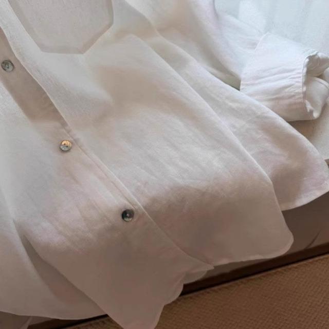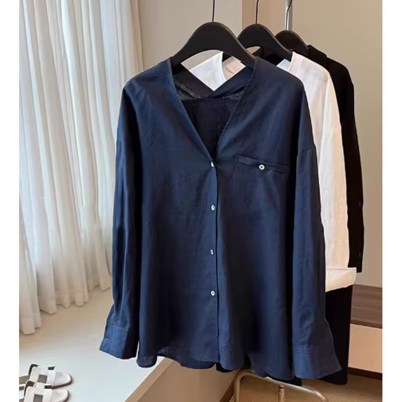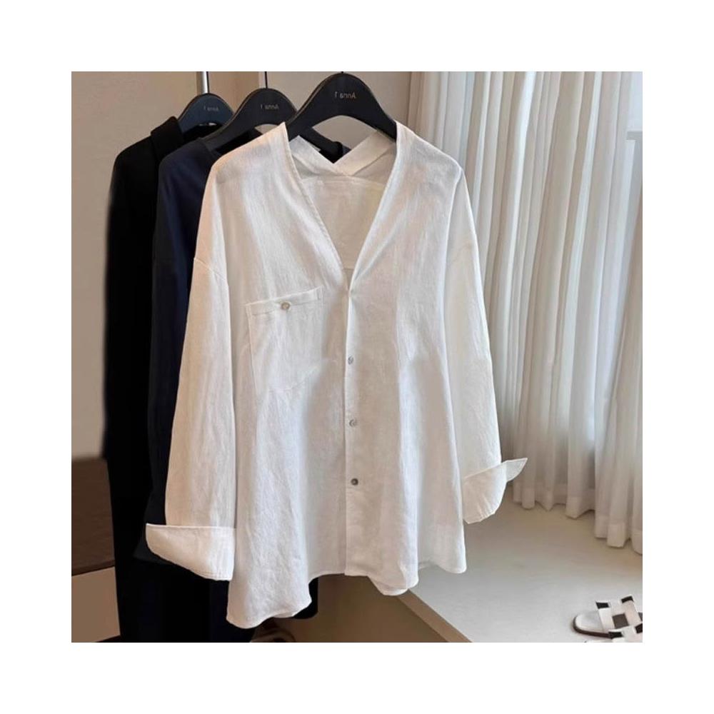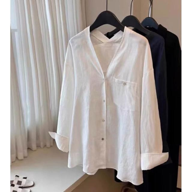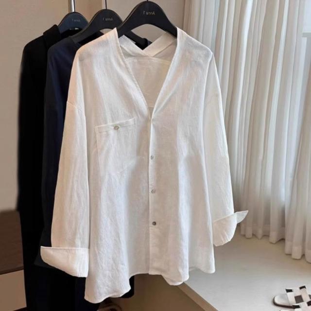 比比優 老錢風松弛感白色苎麻長袖襯衫女春夏季寬松V領慵懶上衣潮