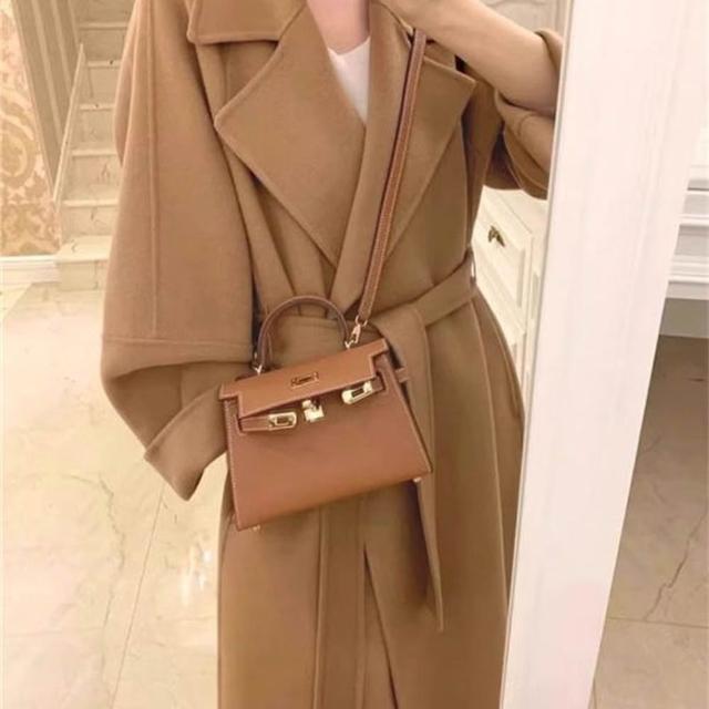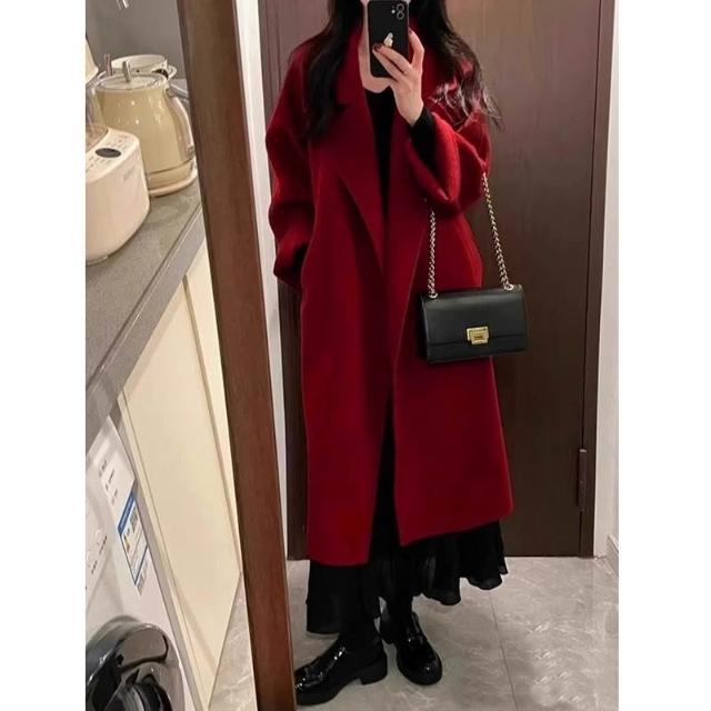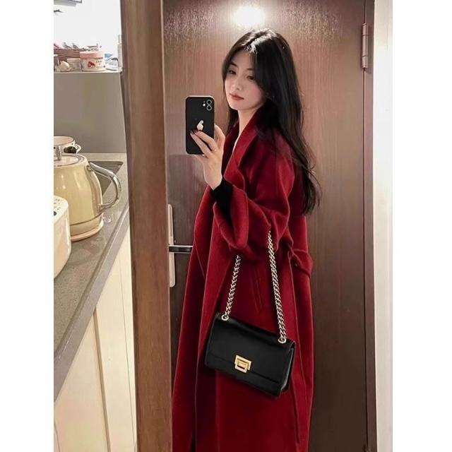 比比優 西西裏紅色雙面羊絨呢子大衣女秋冬季韓系赫本風高級感羊毛呢外套
