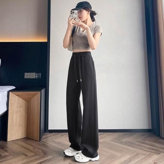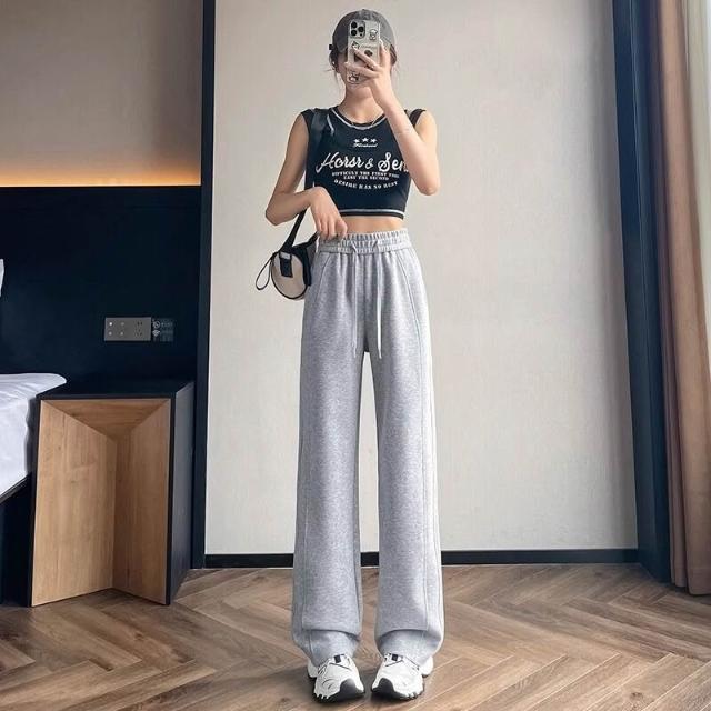 比比優 灰色運動褲女秋冬垂感直筒加厚休閑褲小個子 窄版加絨闊腿衛褲