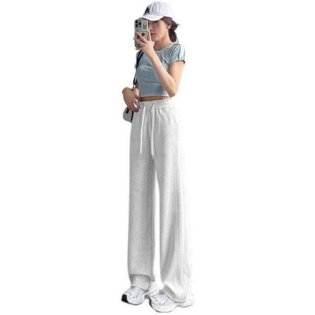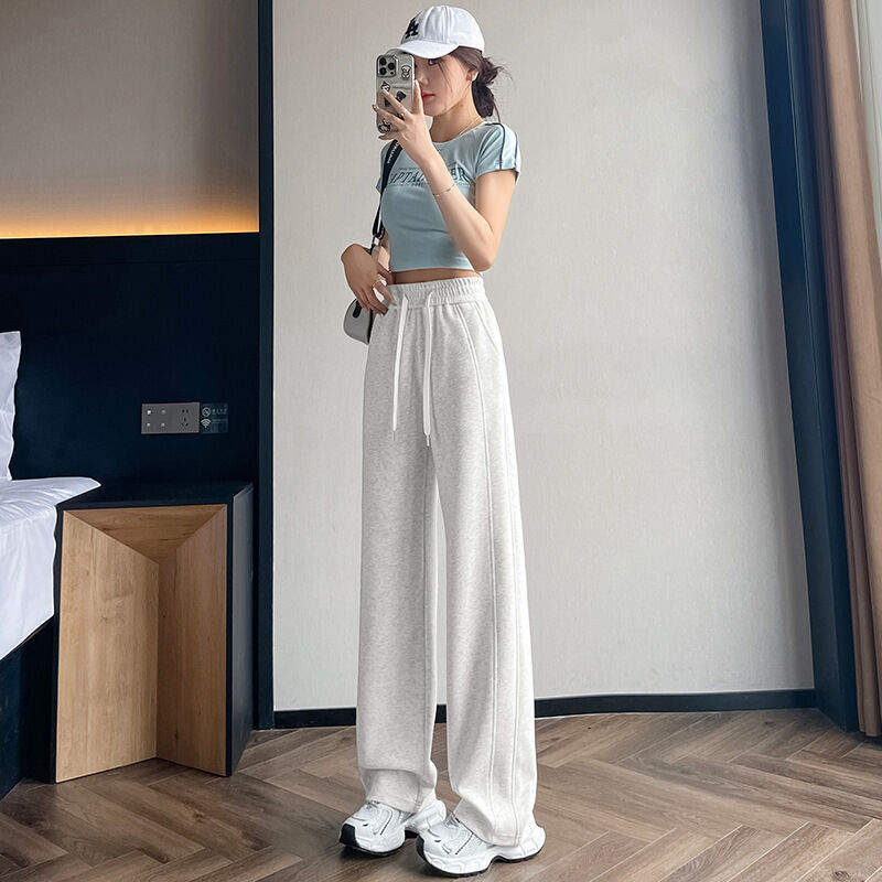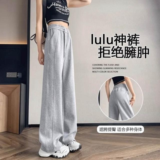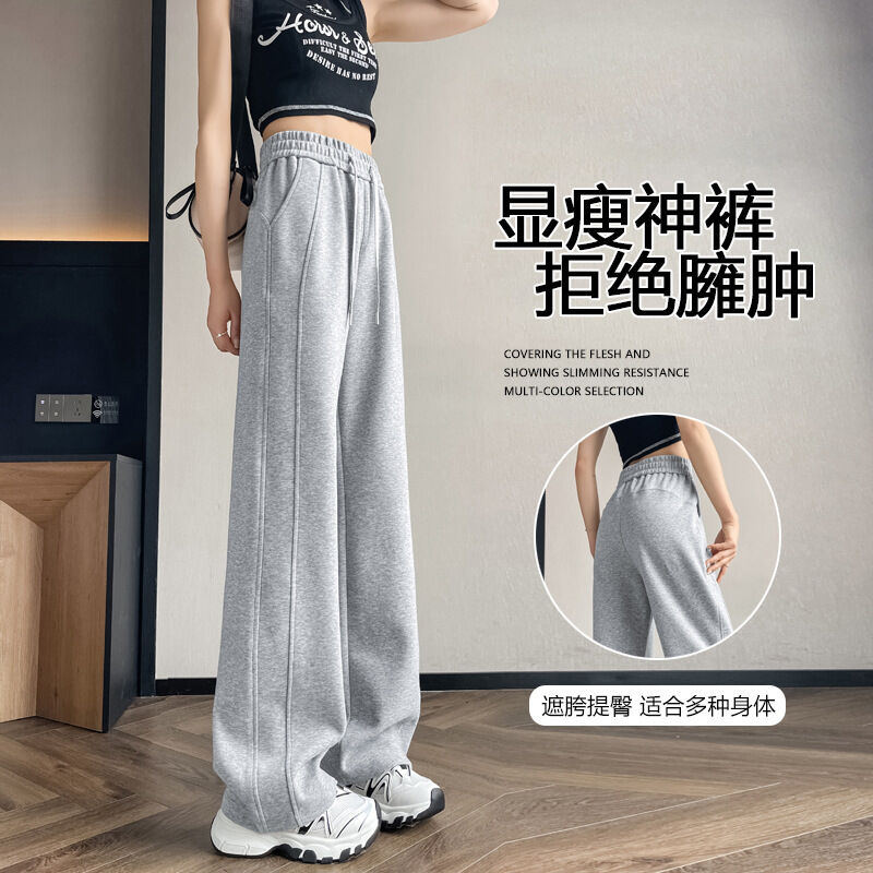 比比優 灰色運動褲女秋冬垂感直筒加厚休閑褲小個子 窄版加絨闊腿衛褲