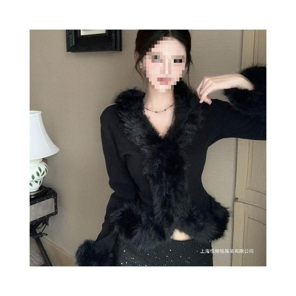 比比優精選 2025秋冬新款純欲風領拼接毛毛邊喇叭袖修身顯瘦外套上衣女黑色