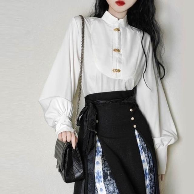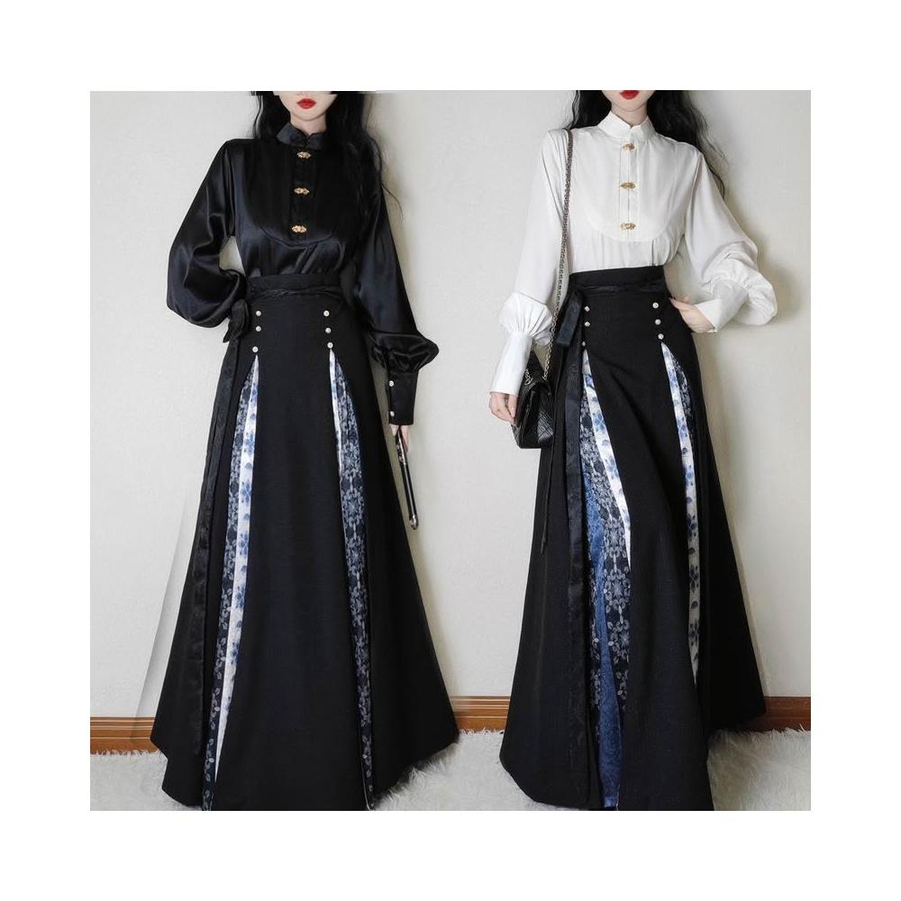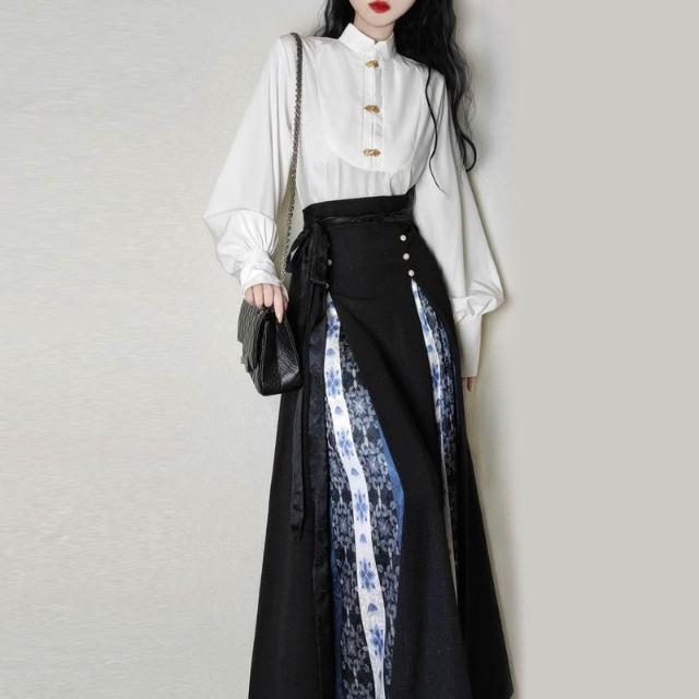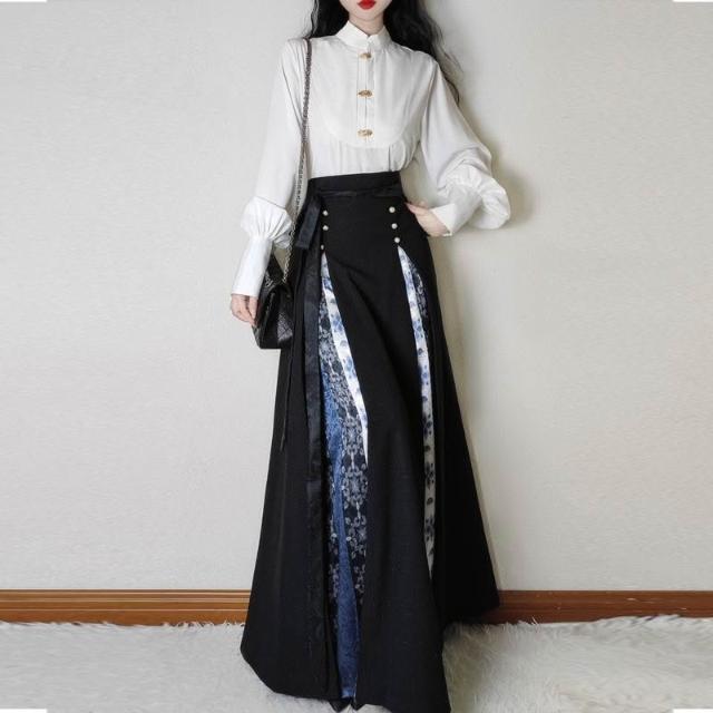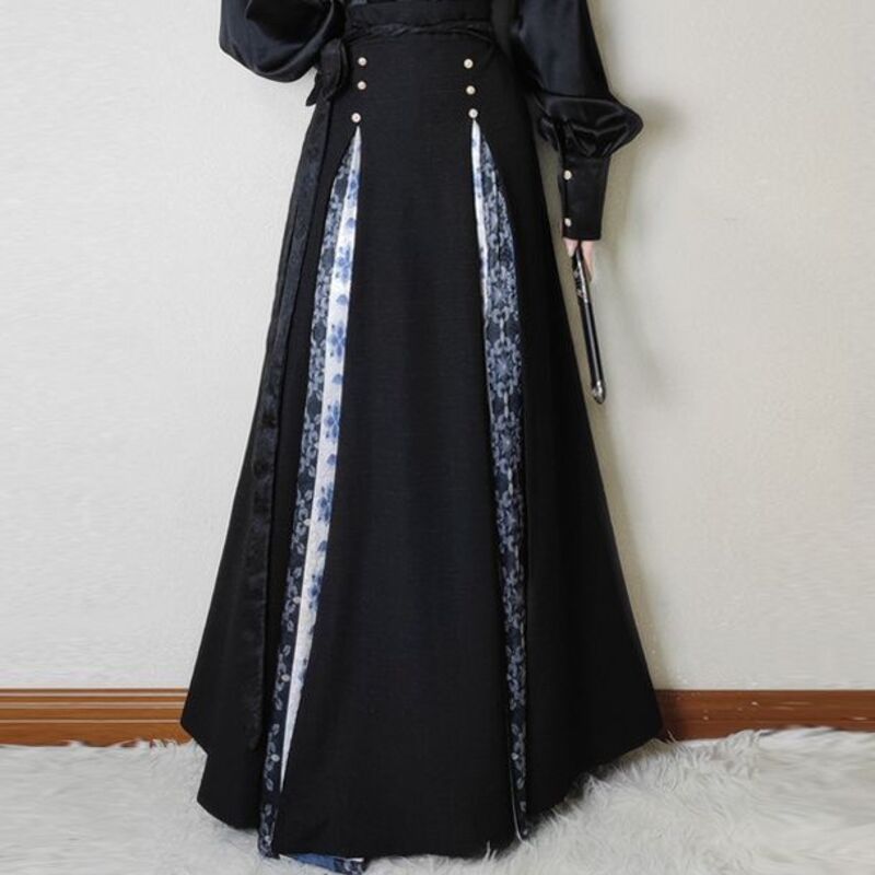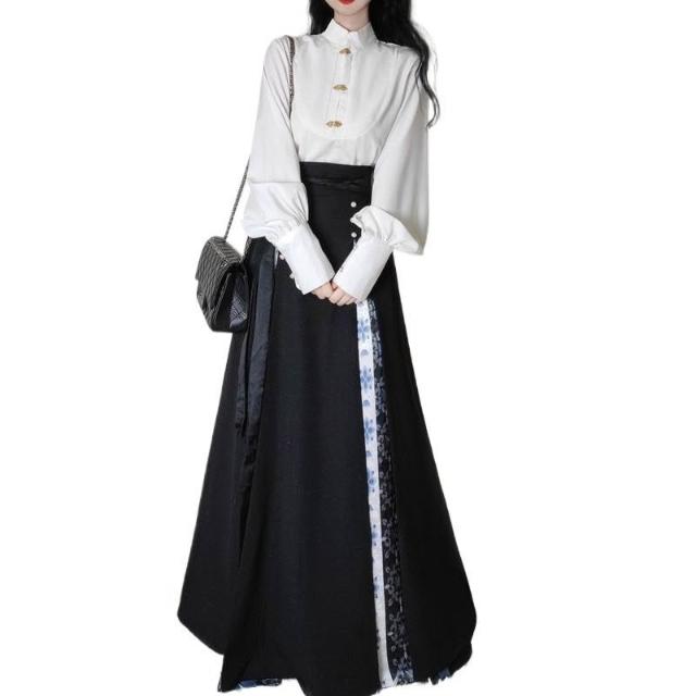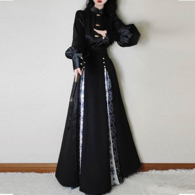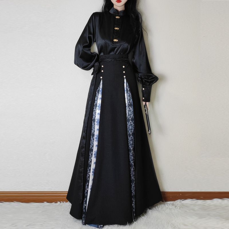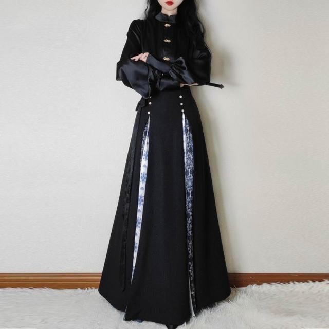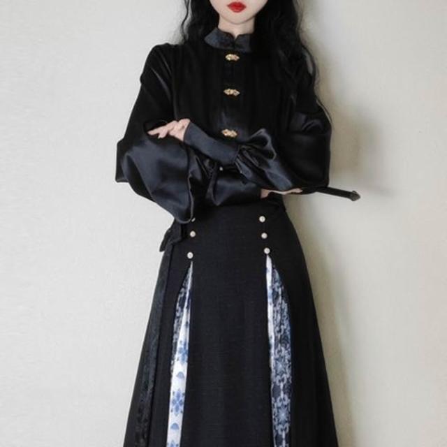 比比優 唐柒安新款日常通勤中式立領套裝馬面改良氣質兩件套國風黑色 漢服