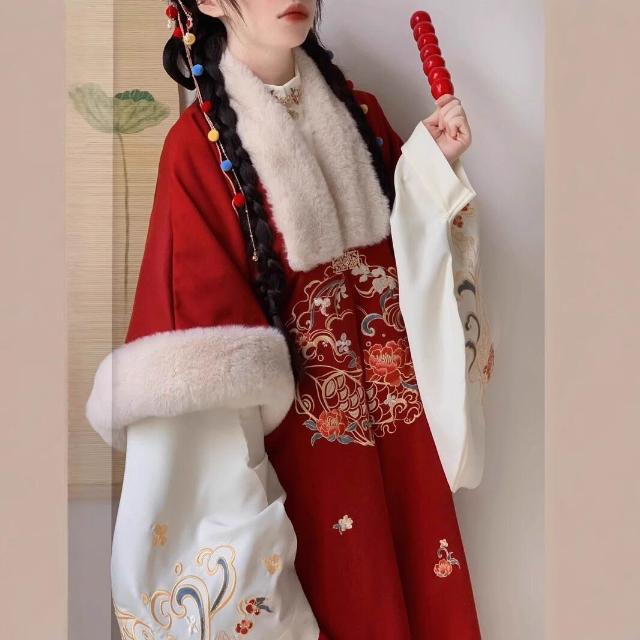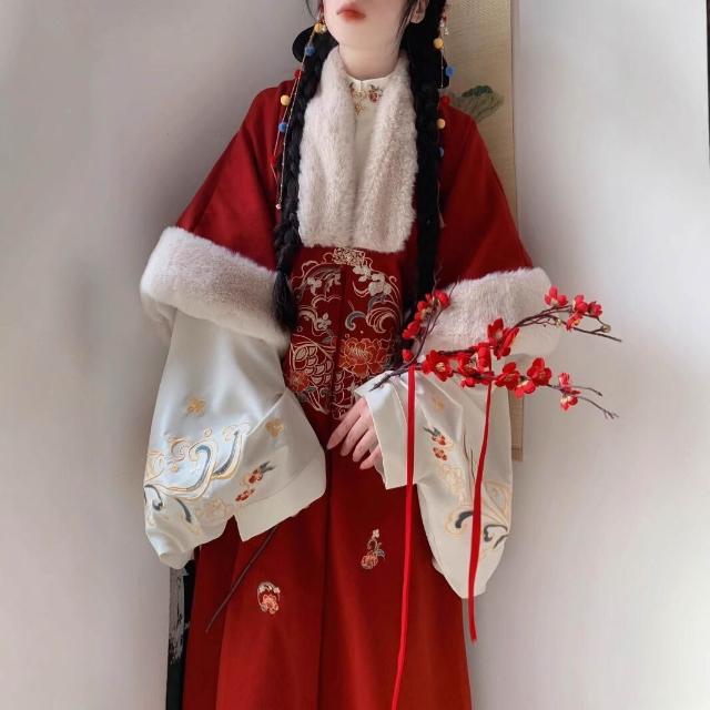 比比優 冬季紅色拜年服新款女漢元素加厚裘衣馬面裙國風套裝 漢服