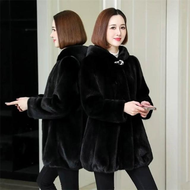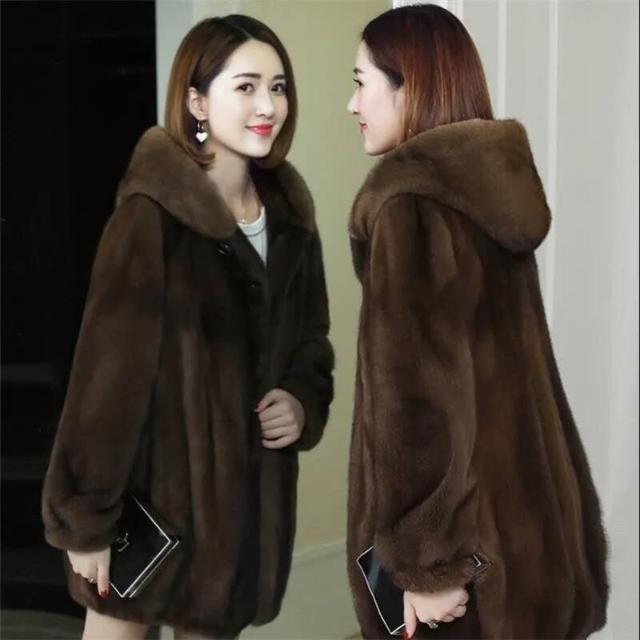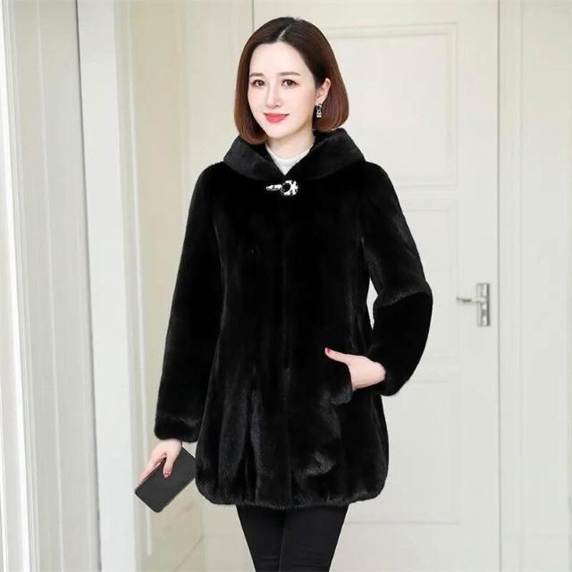 比比優 新品仿皮草外套女2025冬季水貂女裝海寧中長款媽媽裝連帽貂皮大衣 洋裝